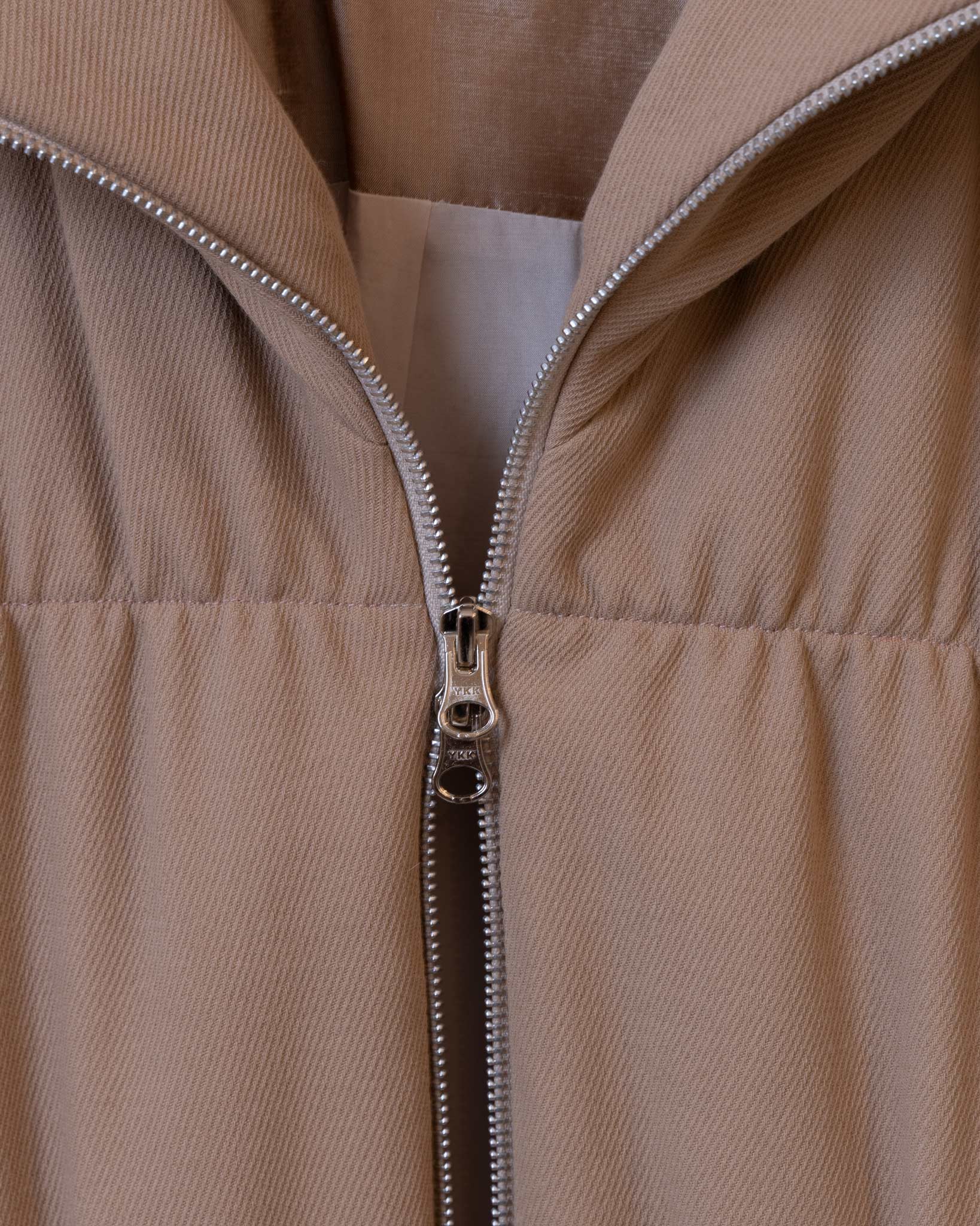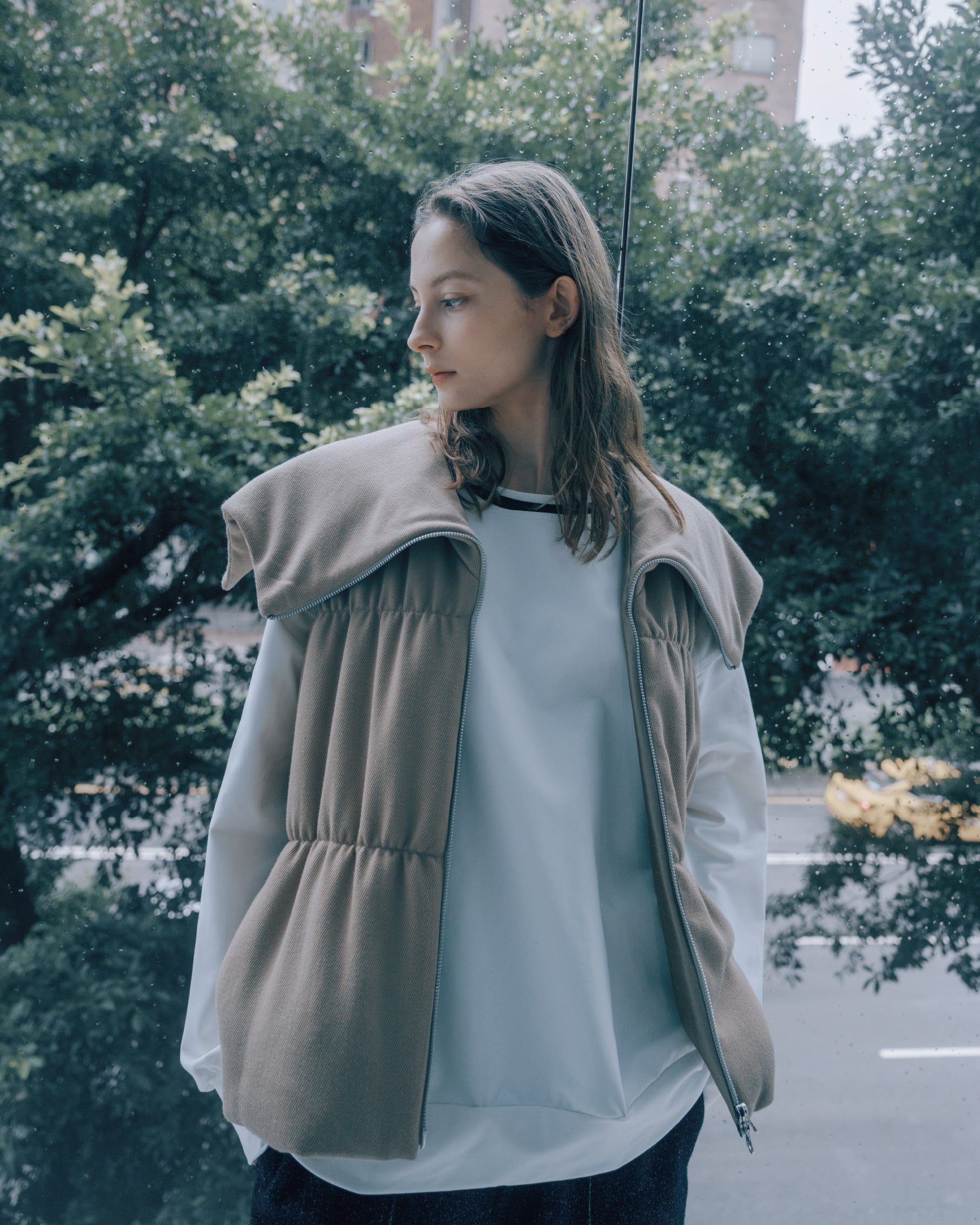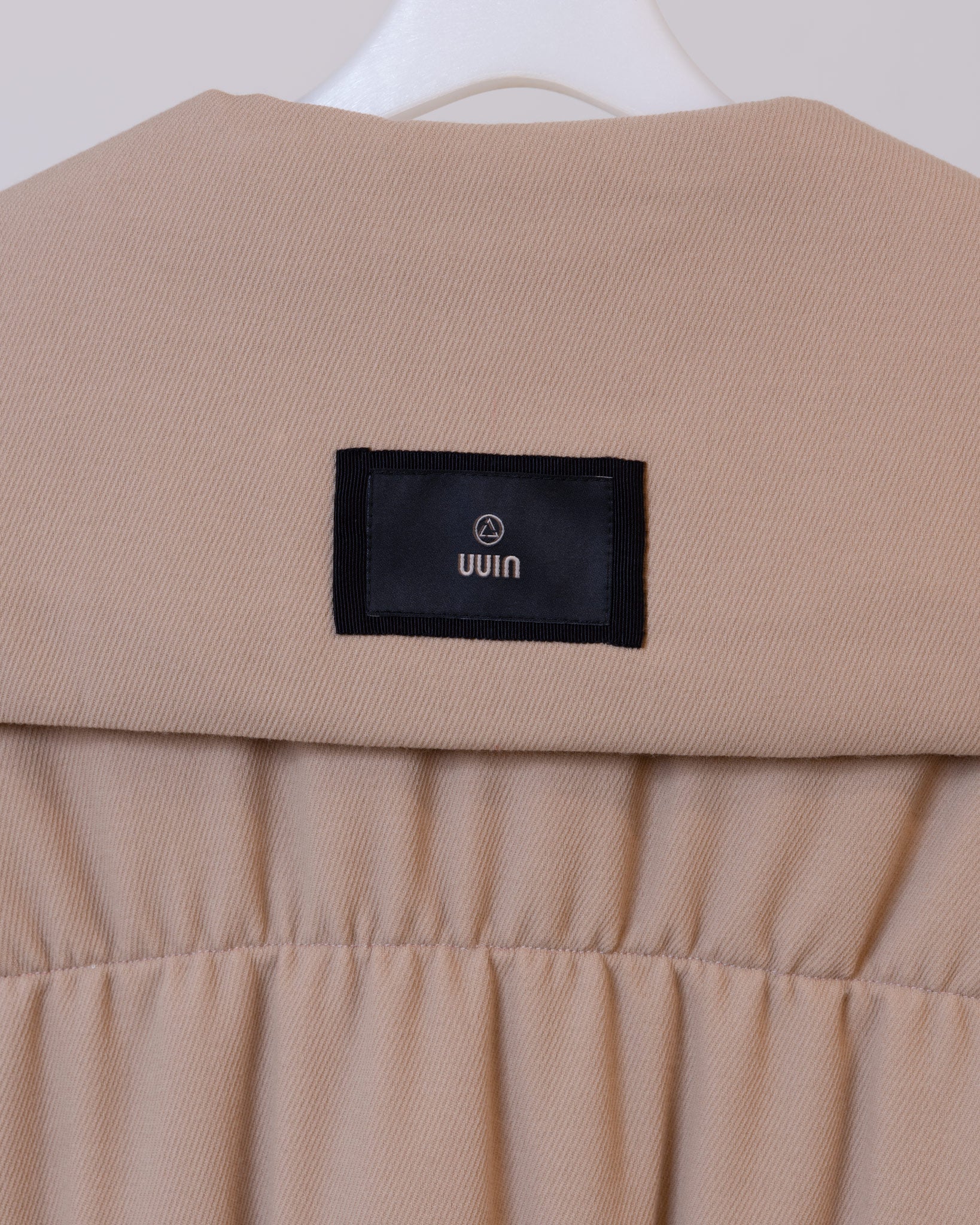 整體輪廓以俐落無袖剪裁,搭配大面積立體領片為亮點,形成鮮明的線條對比。上半身透過內斂的抽皺手法,使表面呈現自然鼓脹並富有層次。寬大立體的領型設計,以類斗篷式結構展開,呼應本季水兵領靈感元素。整體布料帶有細膩斜紋織理,微微的霧光感提升整體質感層次。