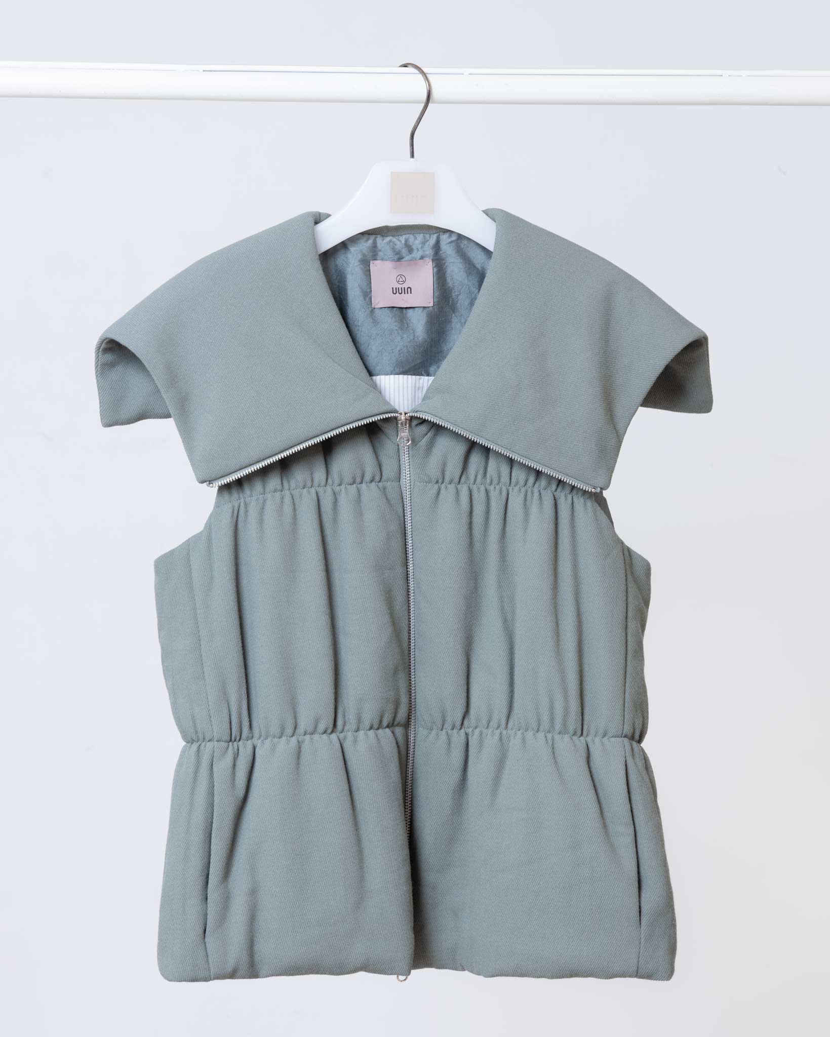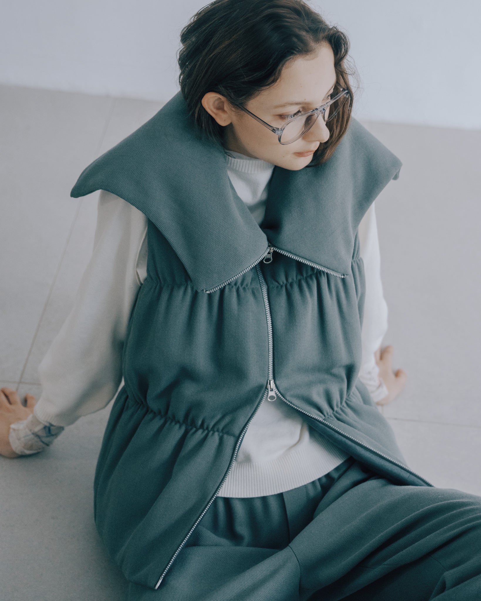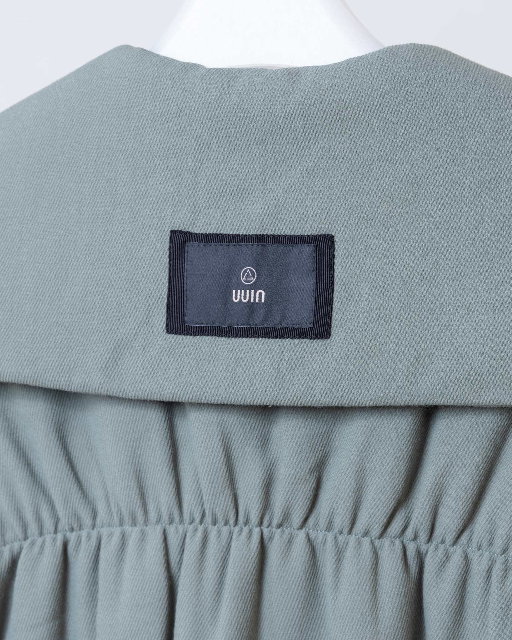 整體輪廓以俐落無袖剪裁,搭配大面積立體領片為亮點,形成鮮明的線條對比。上半身透過內斂的抽皺手法,使表面呈現自然鼓脹並富有層次。寬大立體的領型設計,以類斗篷式結構展開,呼應本季水兵領靈感元素。整體布料帶有細膩斜紋織理,微微的霧光感提升整體質感層次。