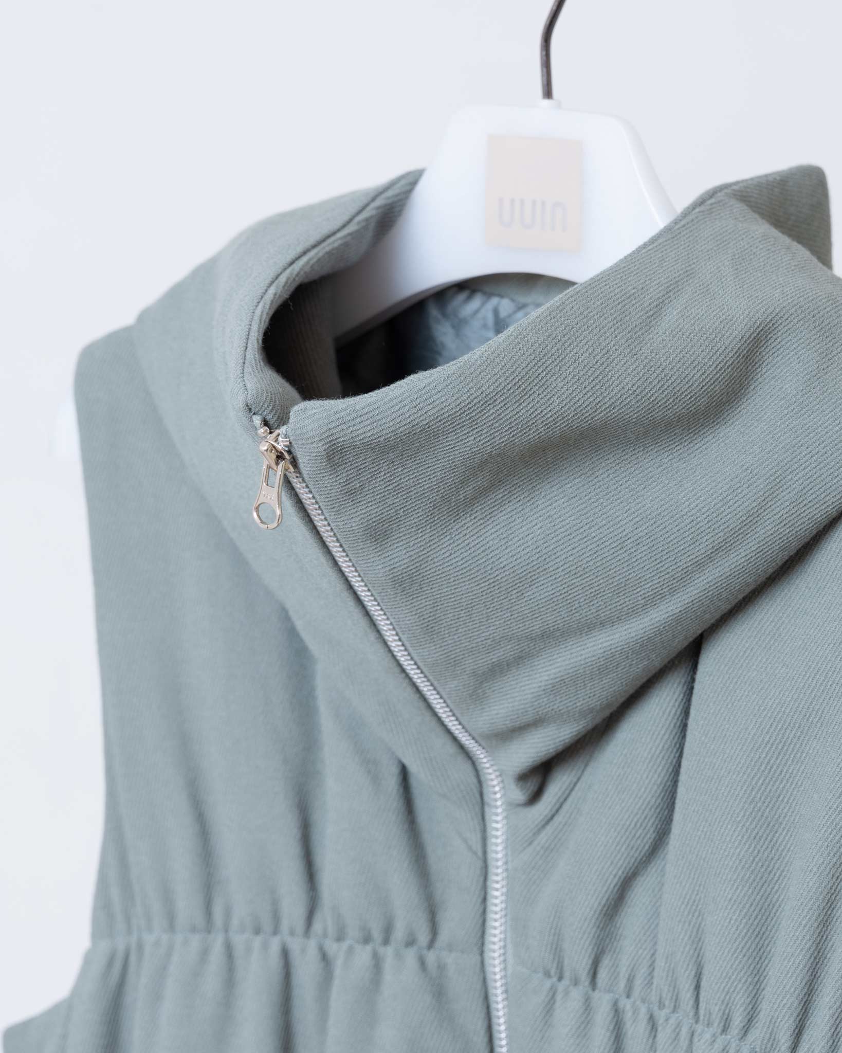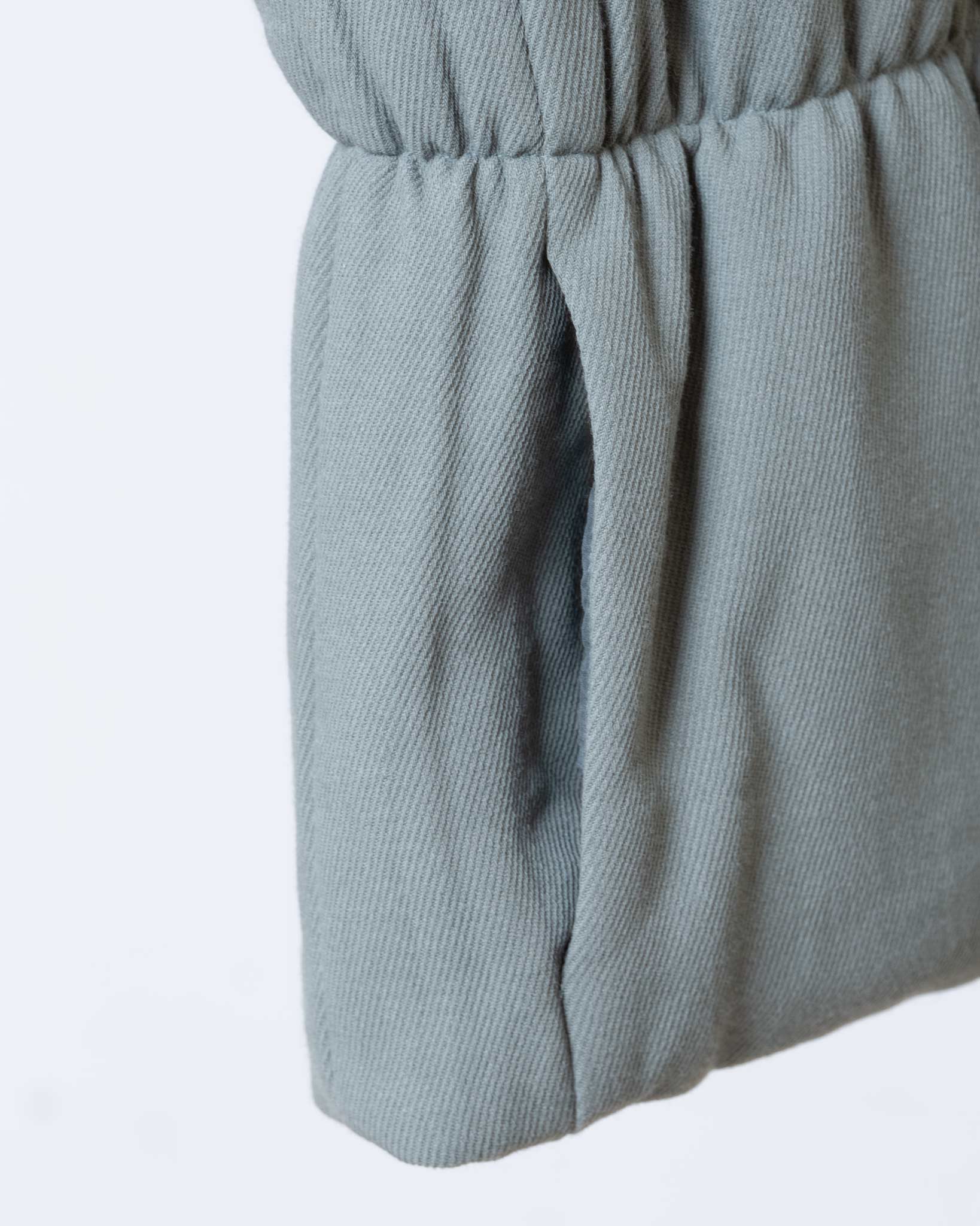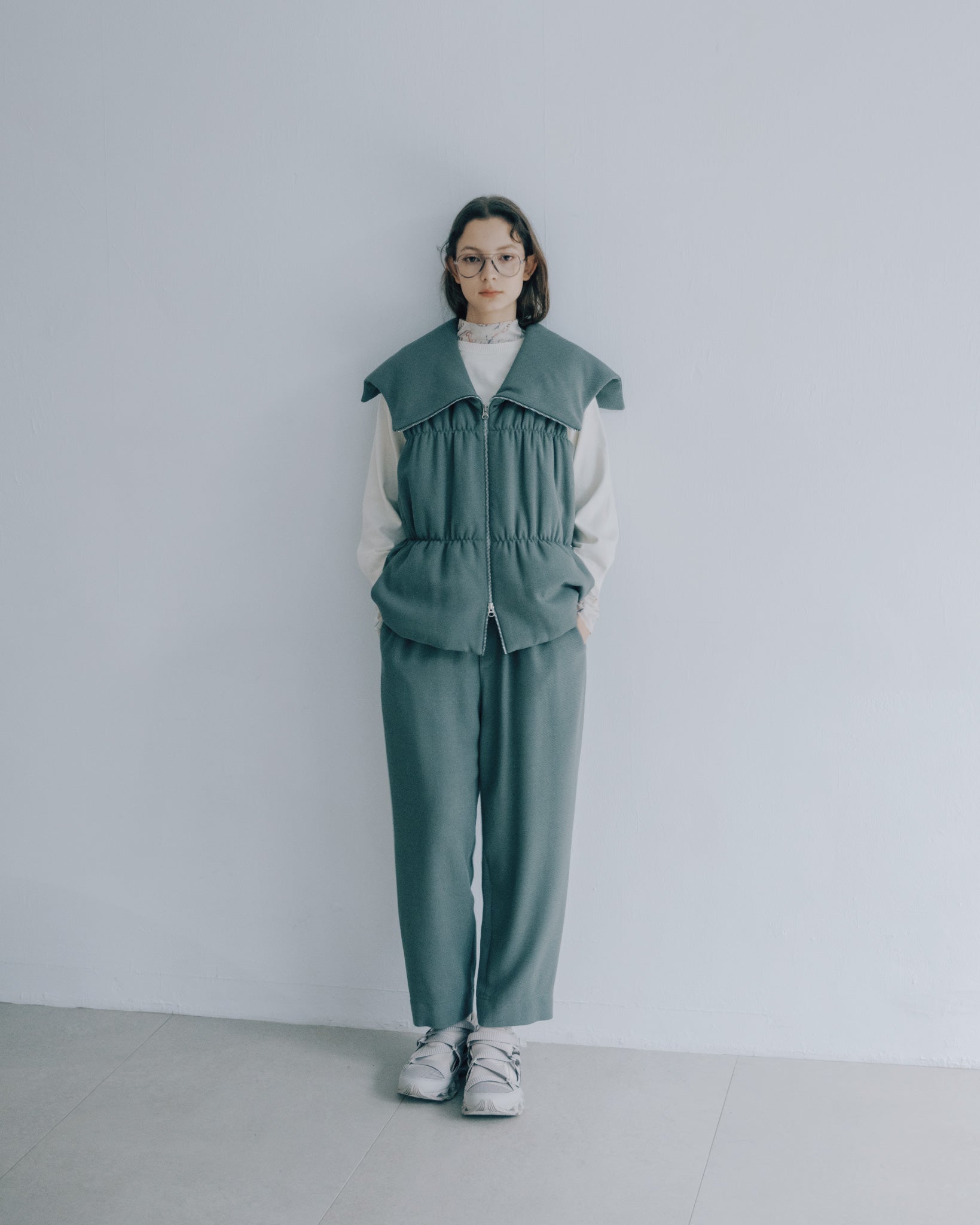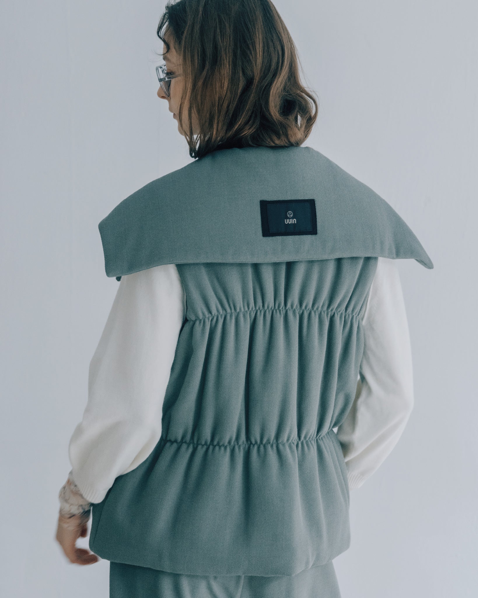 整體輪廓以俐落無袖剪裁,搭配大面積立體領片為亮點,形成鮮明的線條對比。上半身透過內斂的抽皺手法,使表面呈現自然鼓脹並富有層次。寬大立體的領型設計,以類斗篷式結構展開,呼應本季水兵領靈感元素。整體布料帶有細膩斜紋織理,微微的霧光感提升整體質感層次。