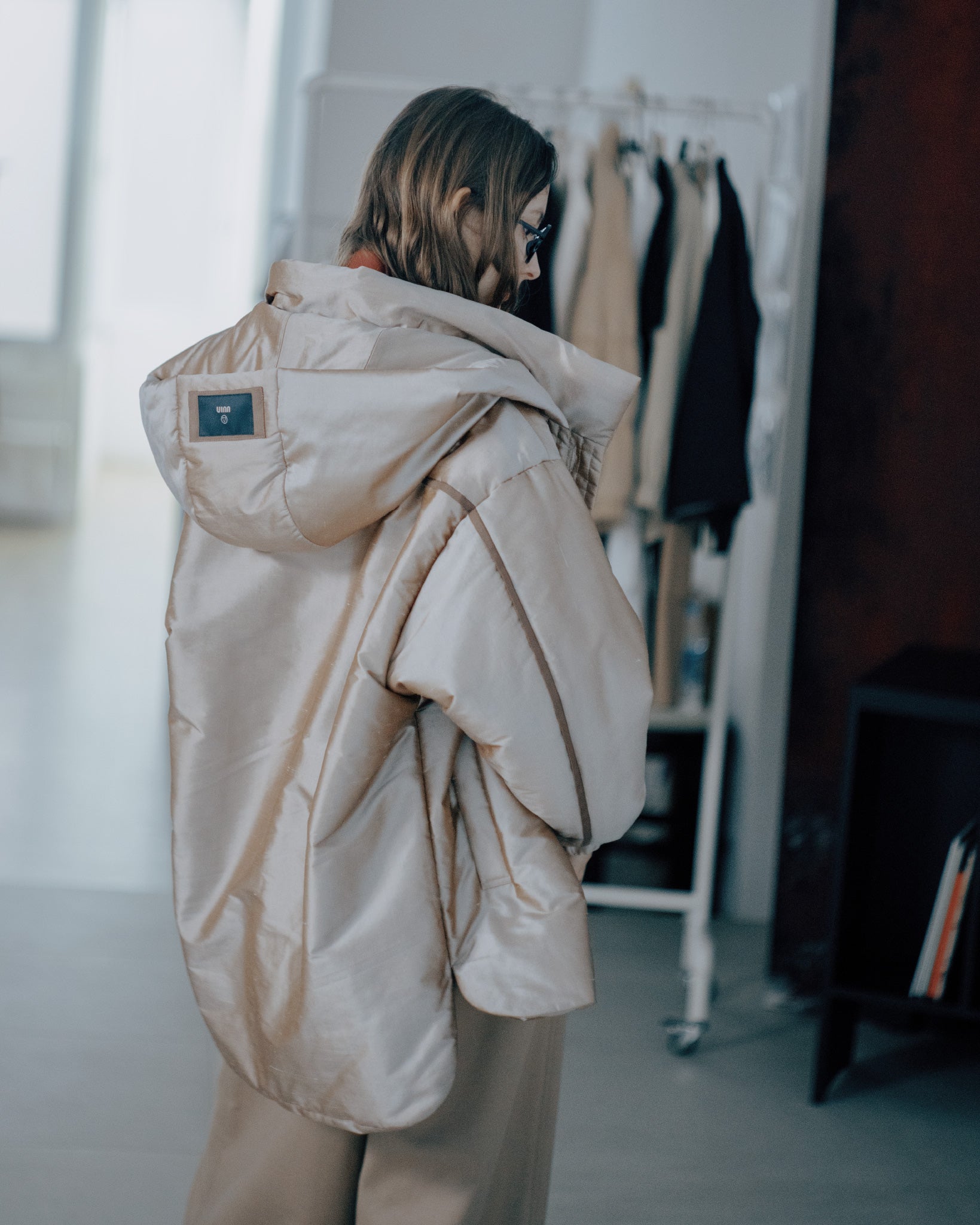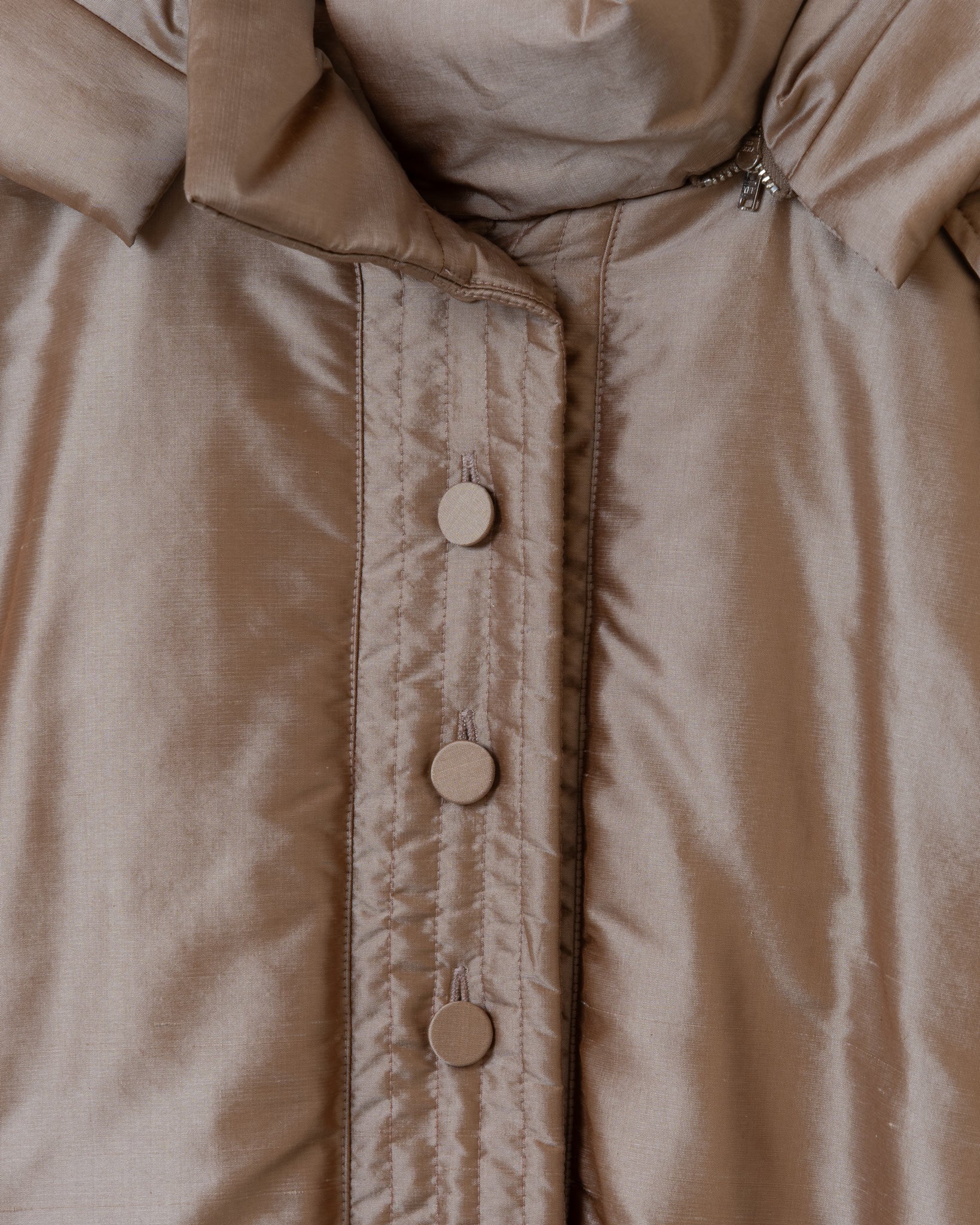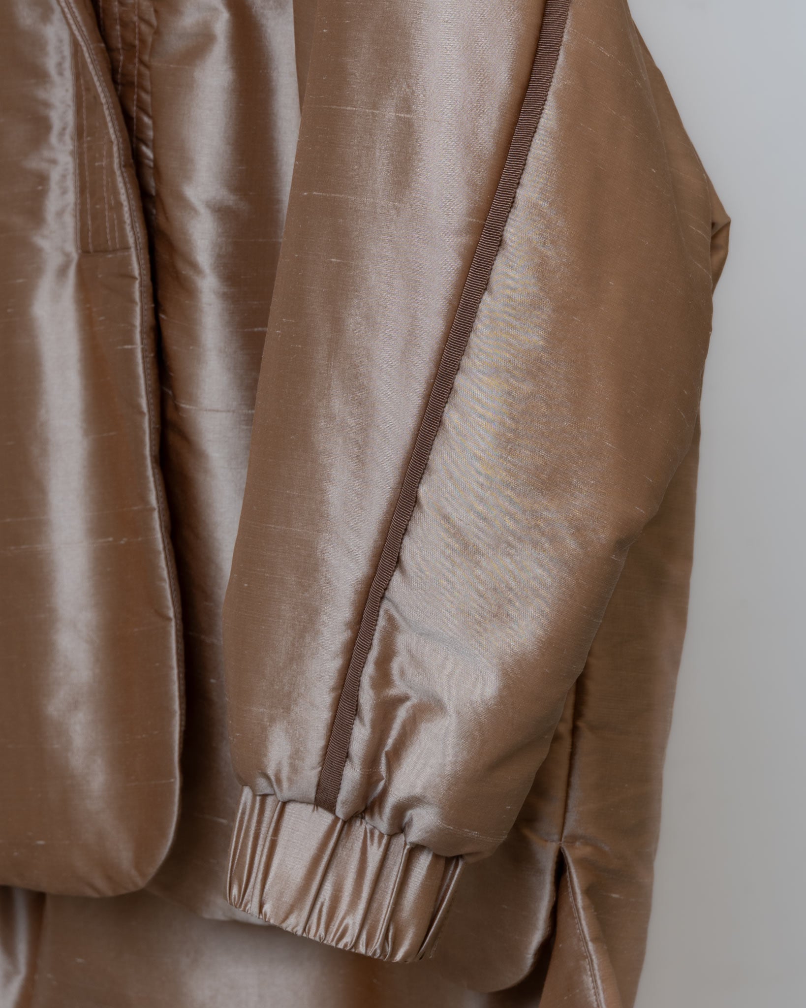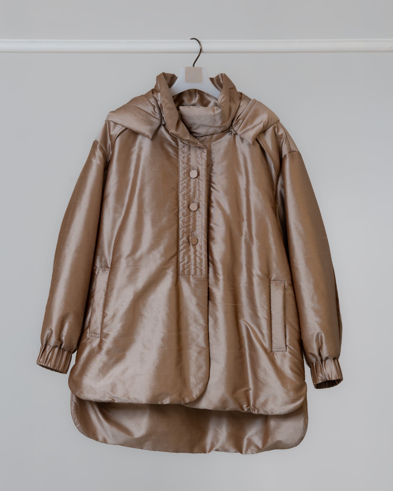 整體選用全蠶絲面料,在光線下展現天然光澤與細膩質感,沙結的自然紋理成為單品的特色之一。門襟採包釦設計,搭配精緻 壓線拼接車縫,兼具功能性與視覺焦點。立領設計修飾頸部線條,使輪廓更顯修長;帽款可拆,隨穿搭需求靈活變化不同風格。袖口鬆緊設計便於活動,並讓手臂線條更加輕盈俐落,整體造型兼具優雅與實用性。