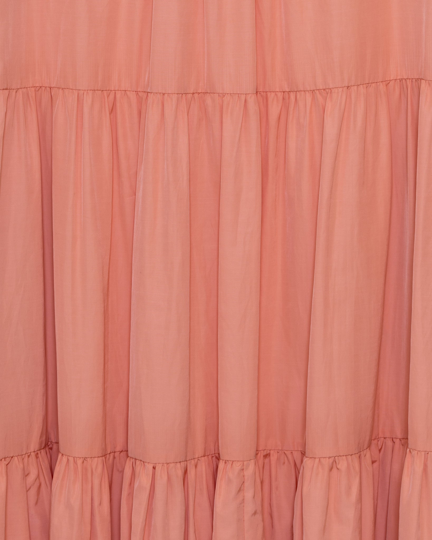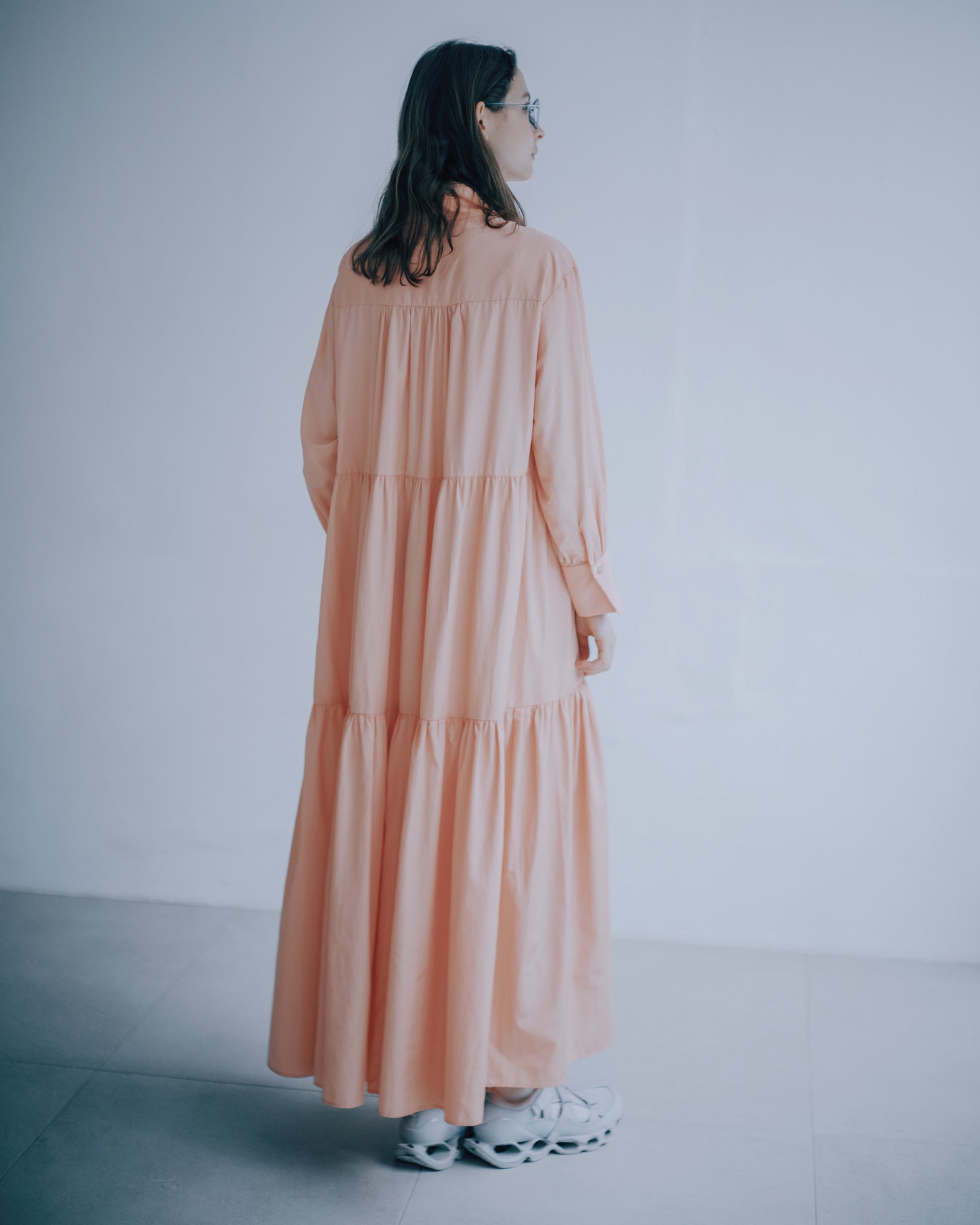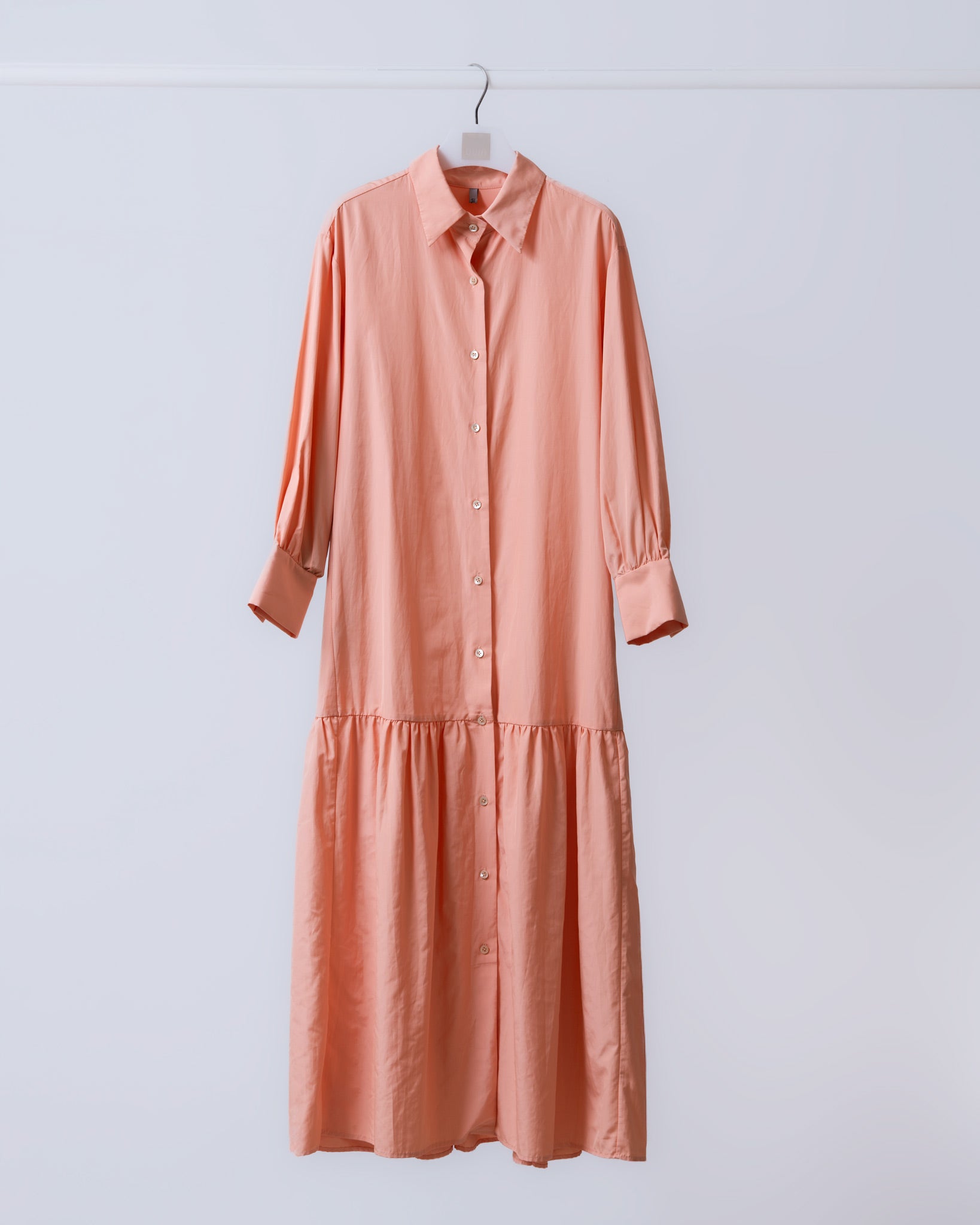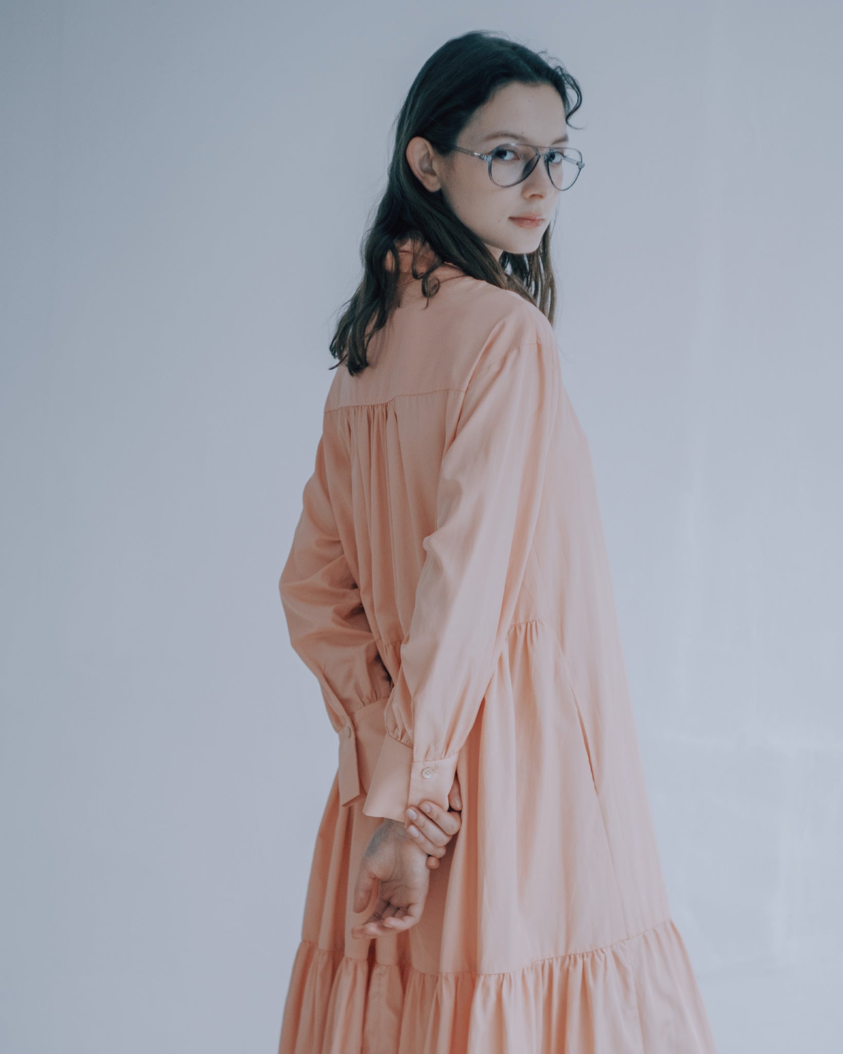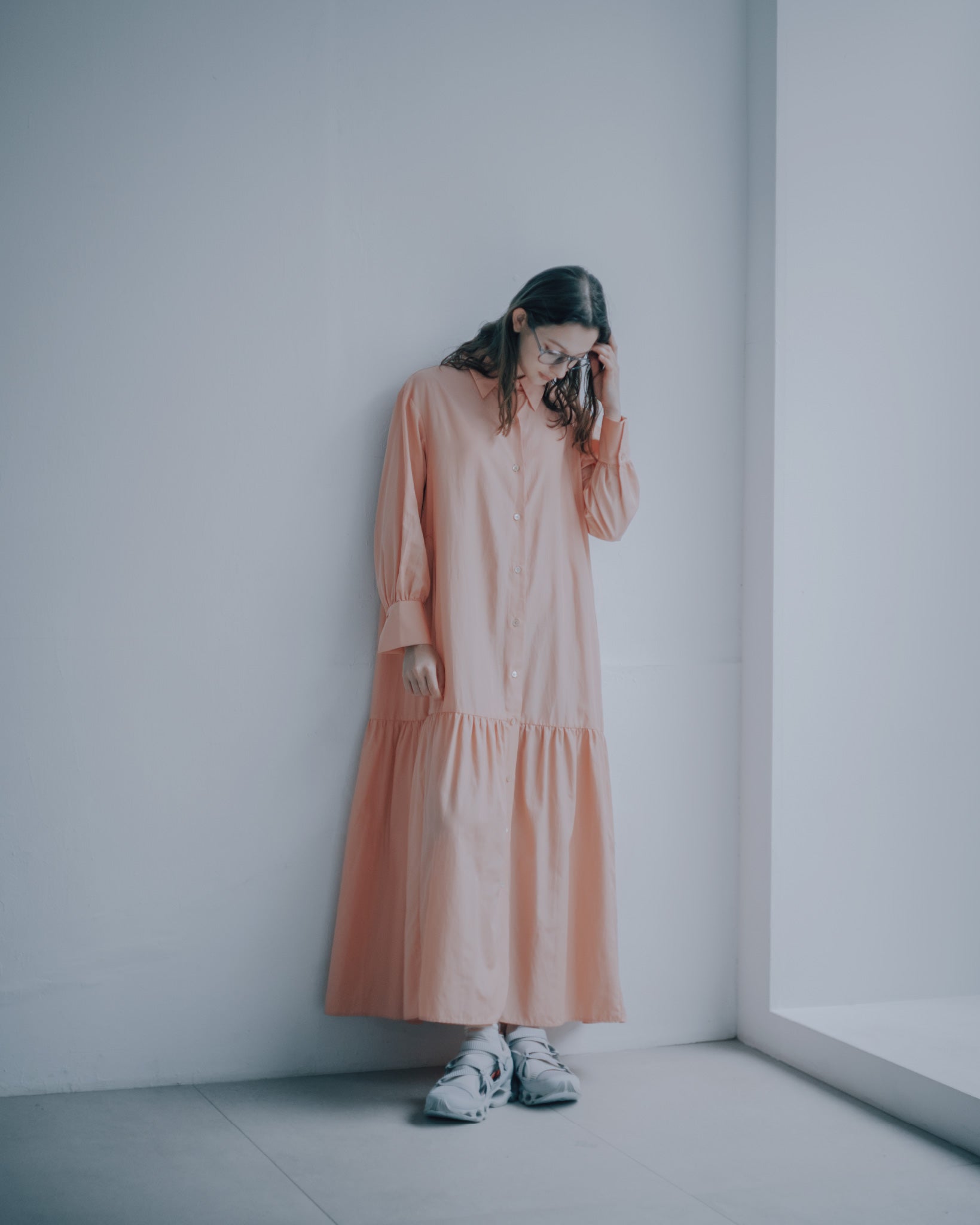 選用具啞光霧面質感的親膚面料,兼具自然垂墜與微微透出的低調光澤感。襯衫式設計可依喜好調整鈕扣扣法,可單穿亦可作為外罩搭配。背面以三層細褶剪接作為設計亮點,兩側附有隱藏式口袋,提升日常機能便利性;隨附連身襯衣內搭,使著用更安心,不擔心透光問題。