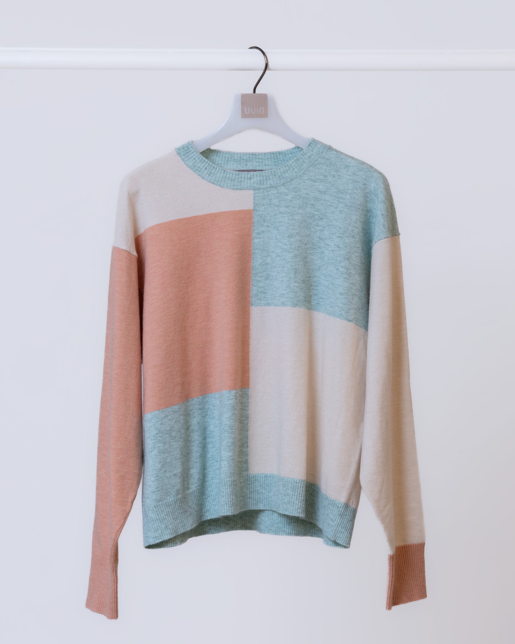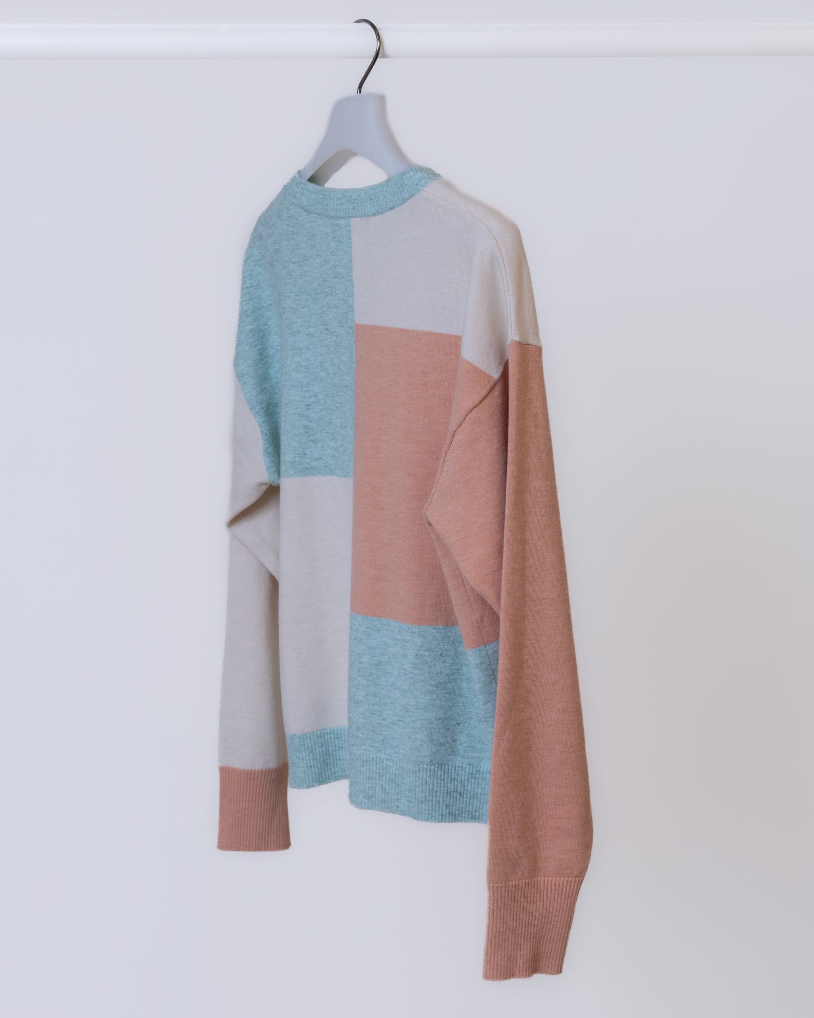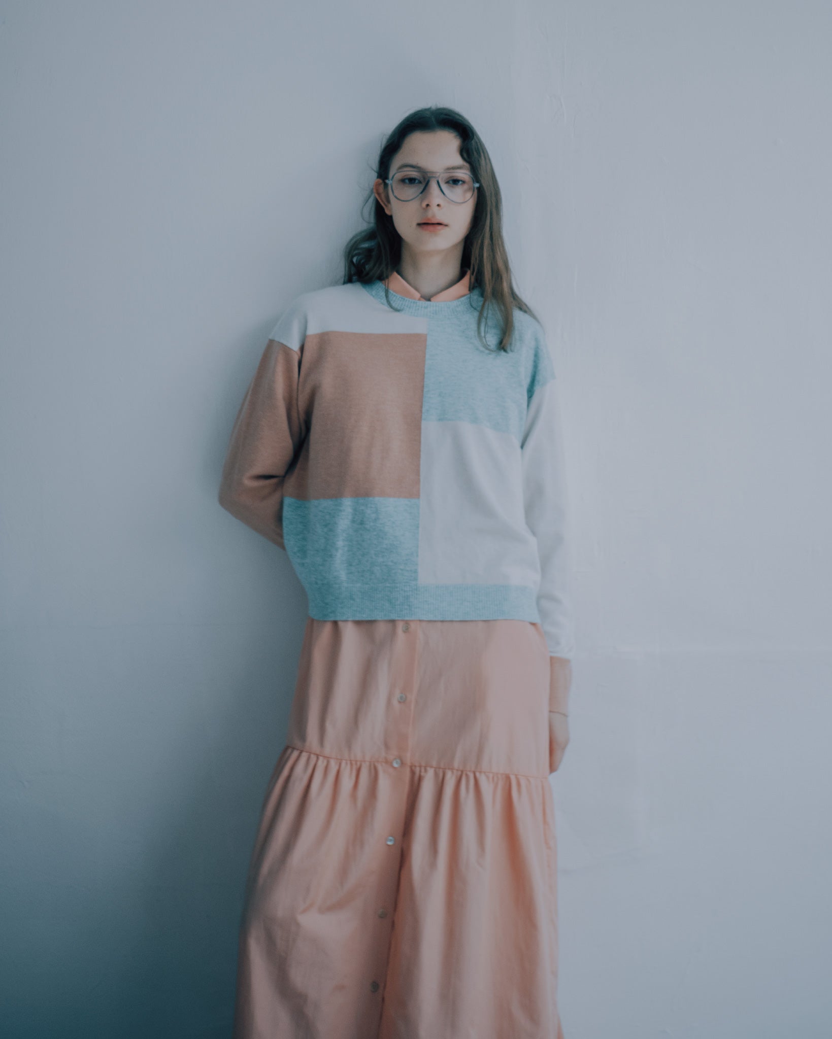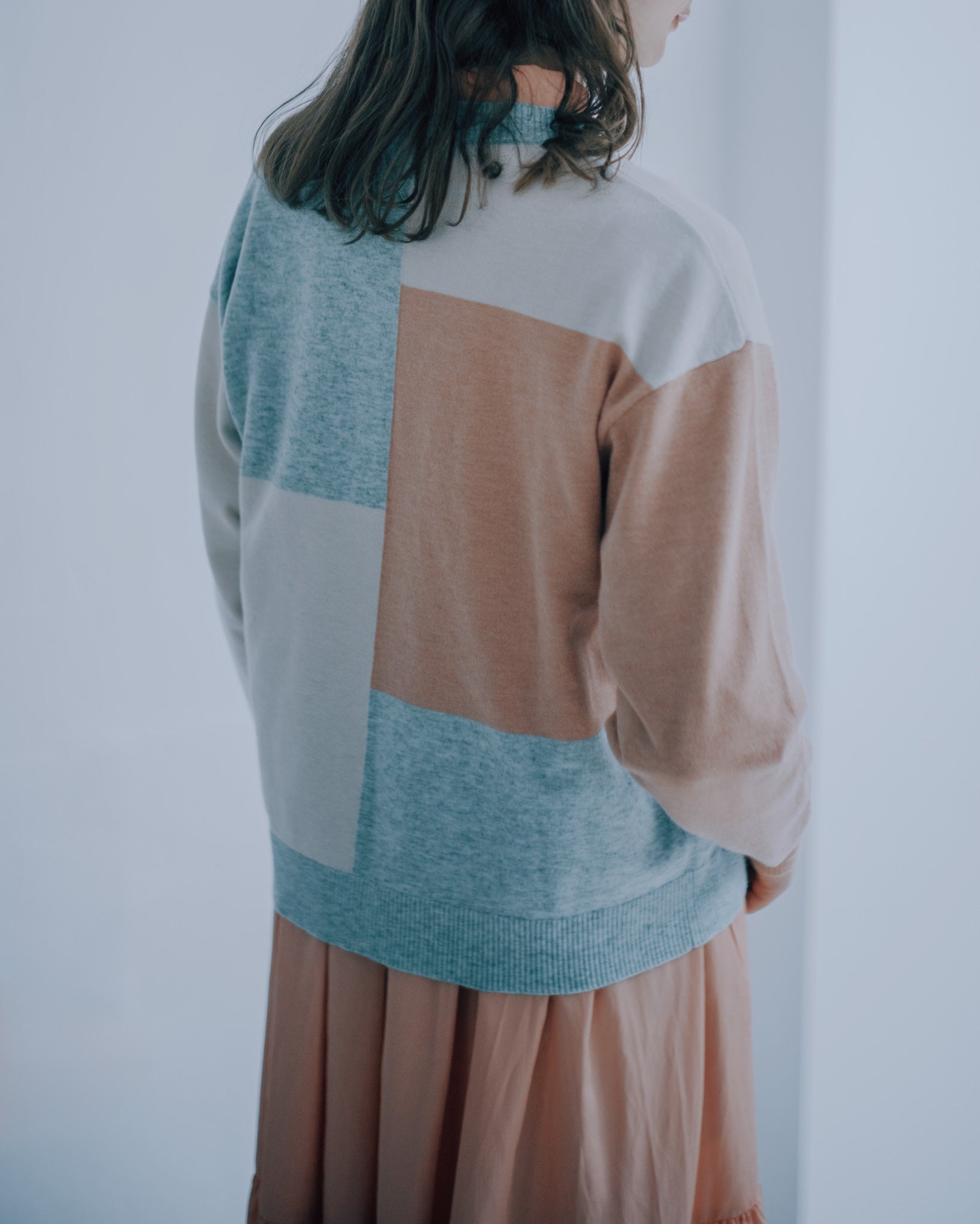 以基隆正濱漁港的彩虹街屋為設計靈感,將繽紛錯落的建築色彩轉化為服裝上的幾何拼接。溫暖的粉橘與柔和的奶油黃構成,呈現輕盈明亮的視覺層次,為秋日穿搭注入溫潤氣息。選用親膚且富彈性的針織布料,柔軟舒適,貼合日常生活中對穿著的多種需求。