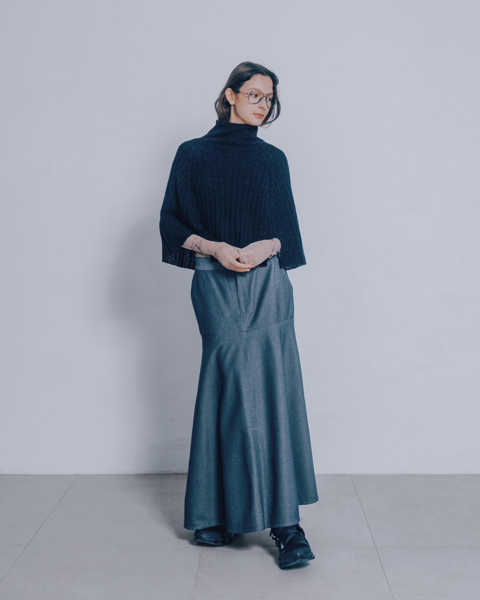 高領寬鬆針織斗篷(黑色)