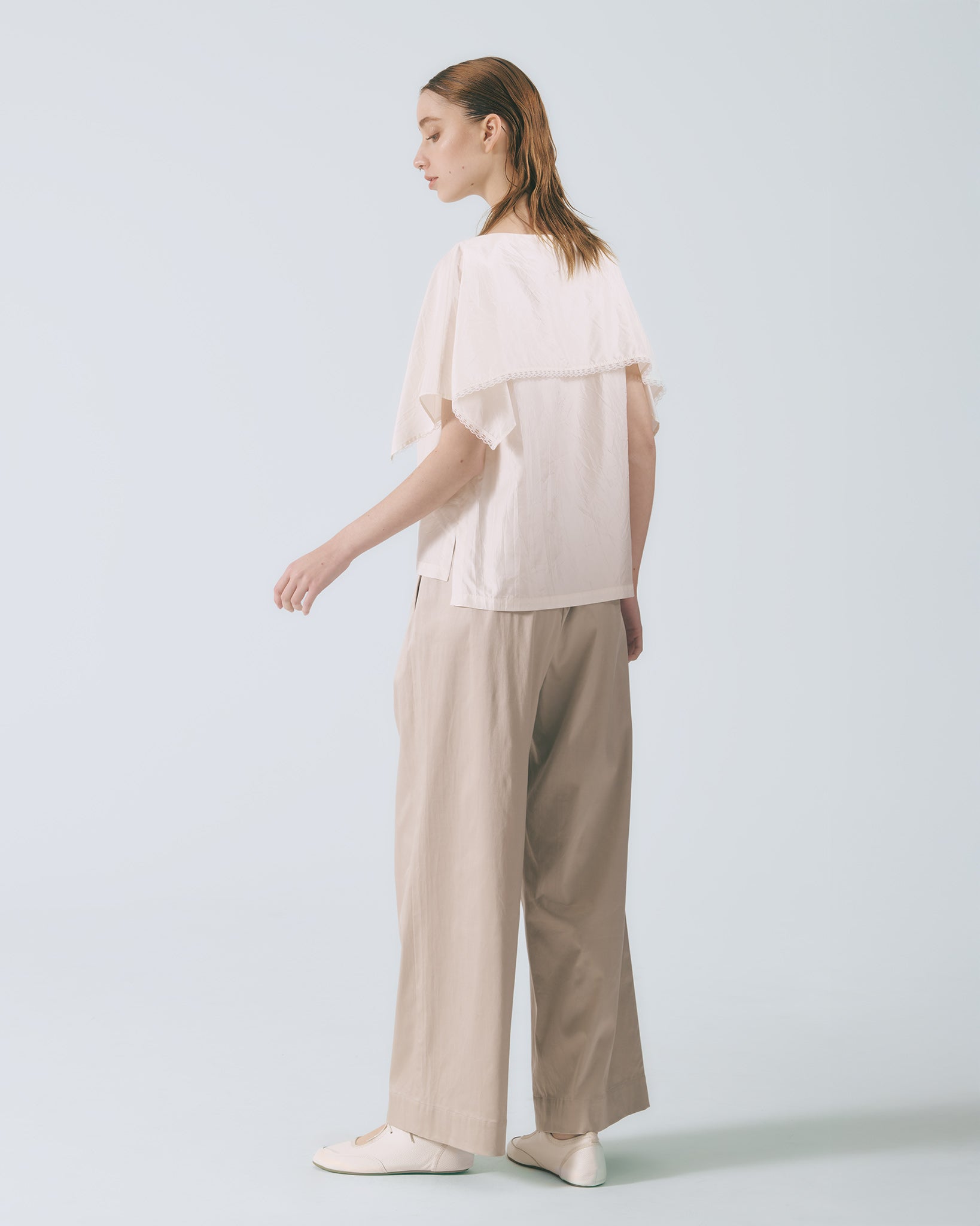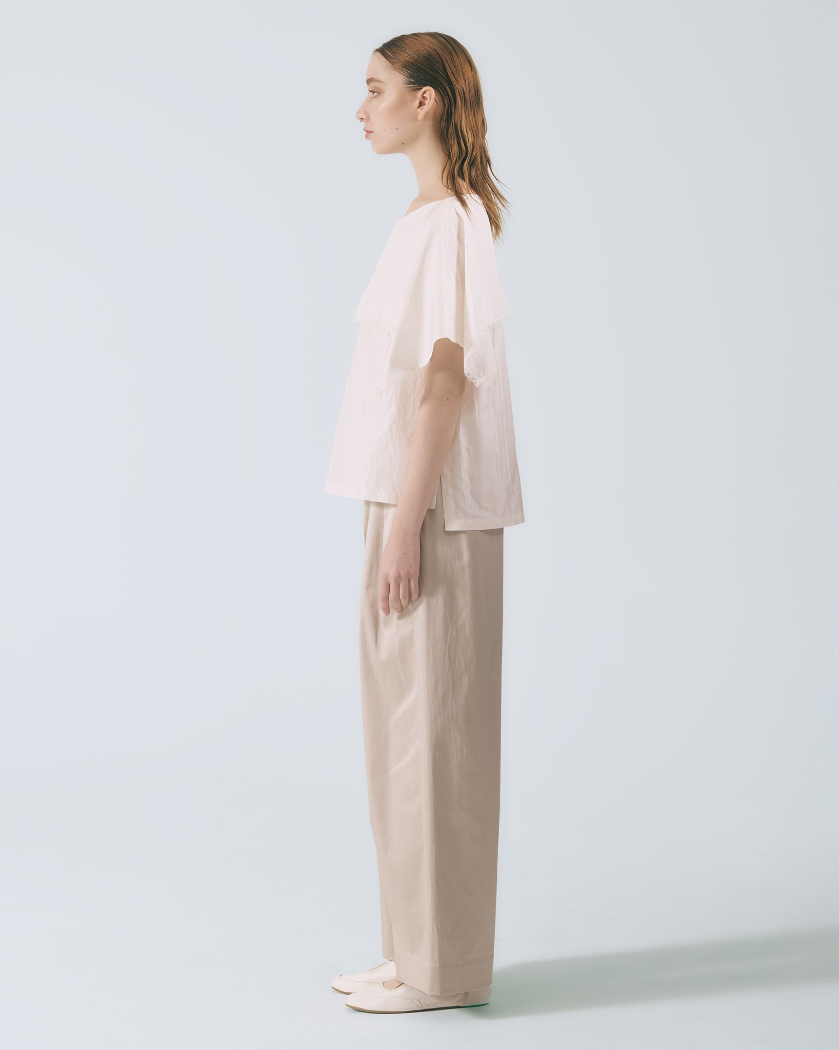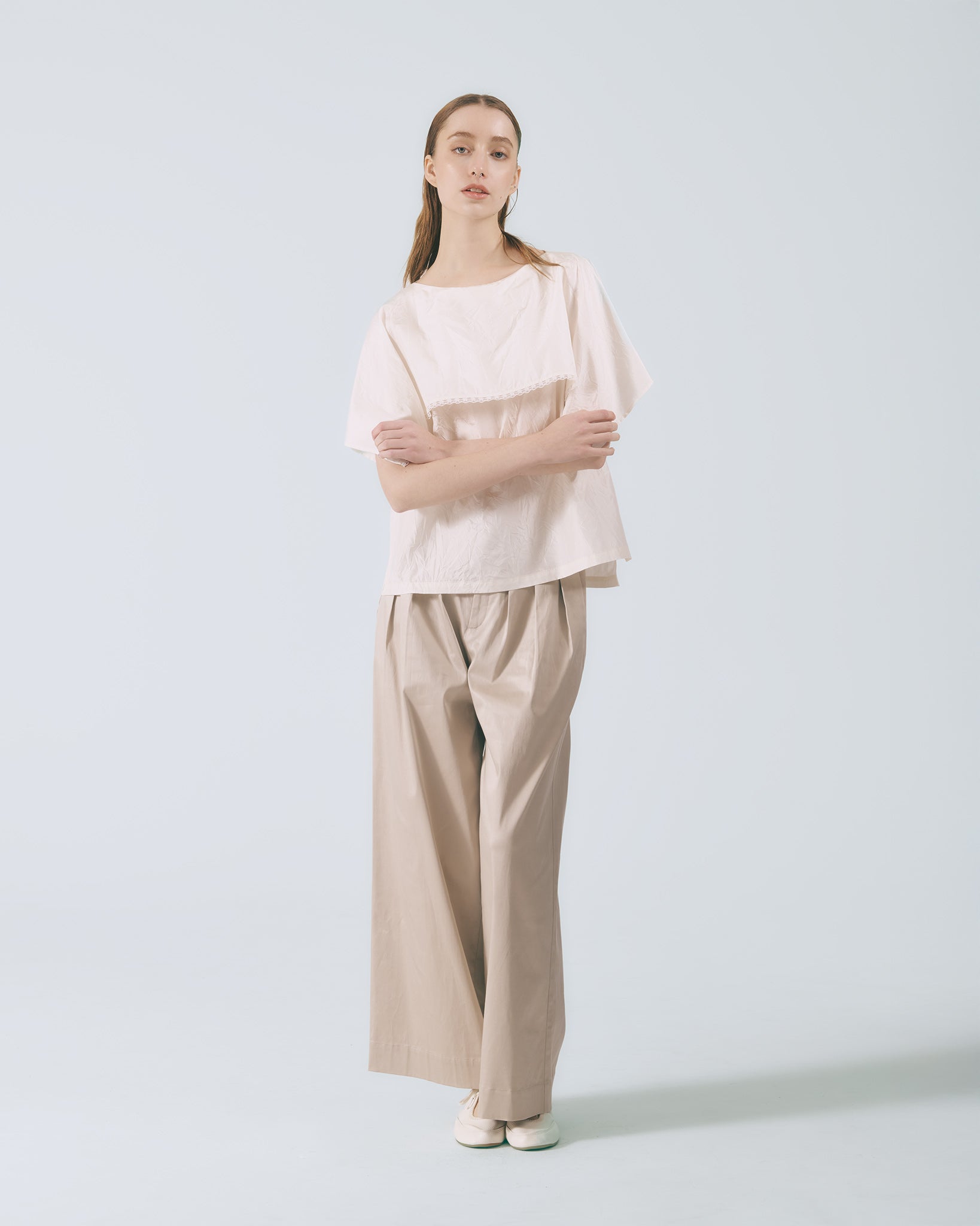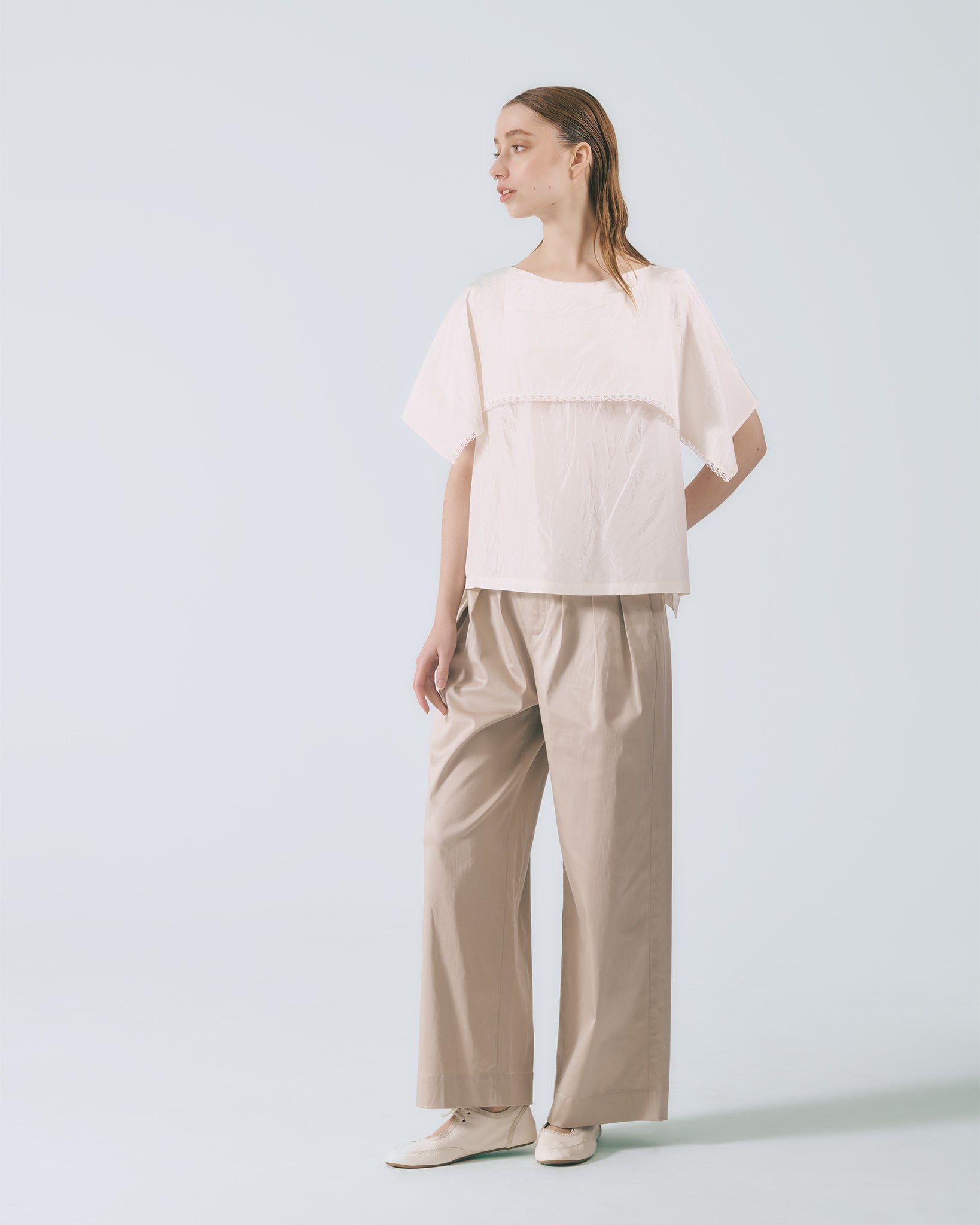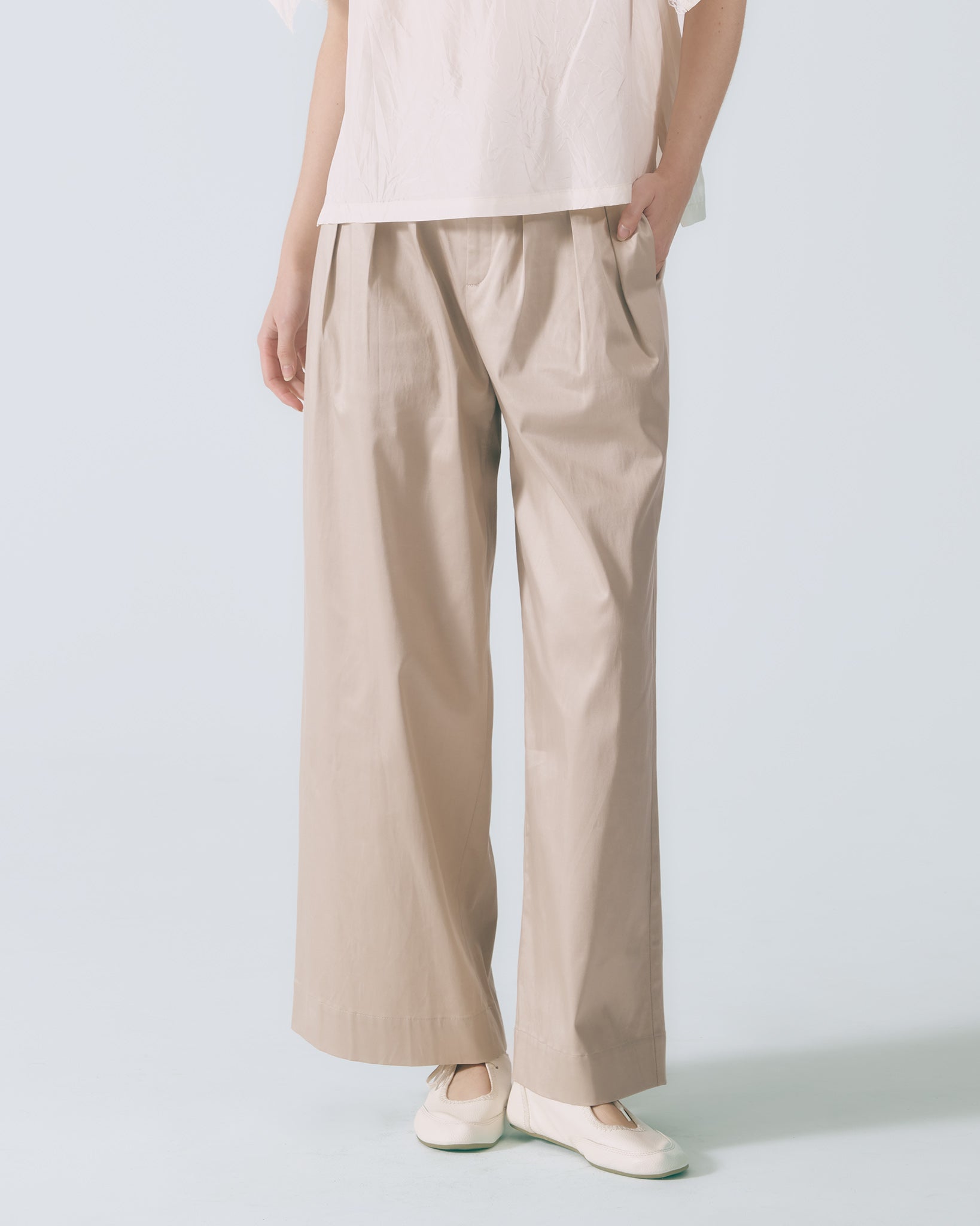 以高腰寬版輪廓為基礎,腰部運用活摺設計堆疊出立體澎摺感,順直的褲管輪廓保有適度垂墜度,隨步伐自然流動,呈現沉穩而細膩的節奏感。兩側配置斜插口袋,兼顧實穿機能,褲口則採用隱藏式拉鍊門襟,收斂細節,使整體線條更顯純粹俐落,在低調中展現深層質感。
