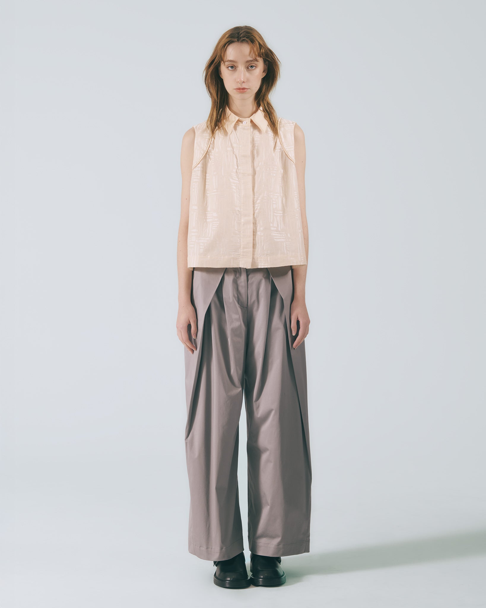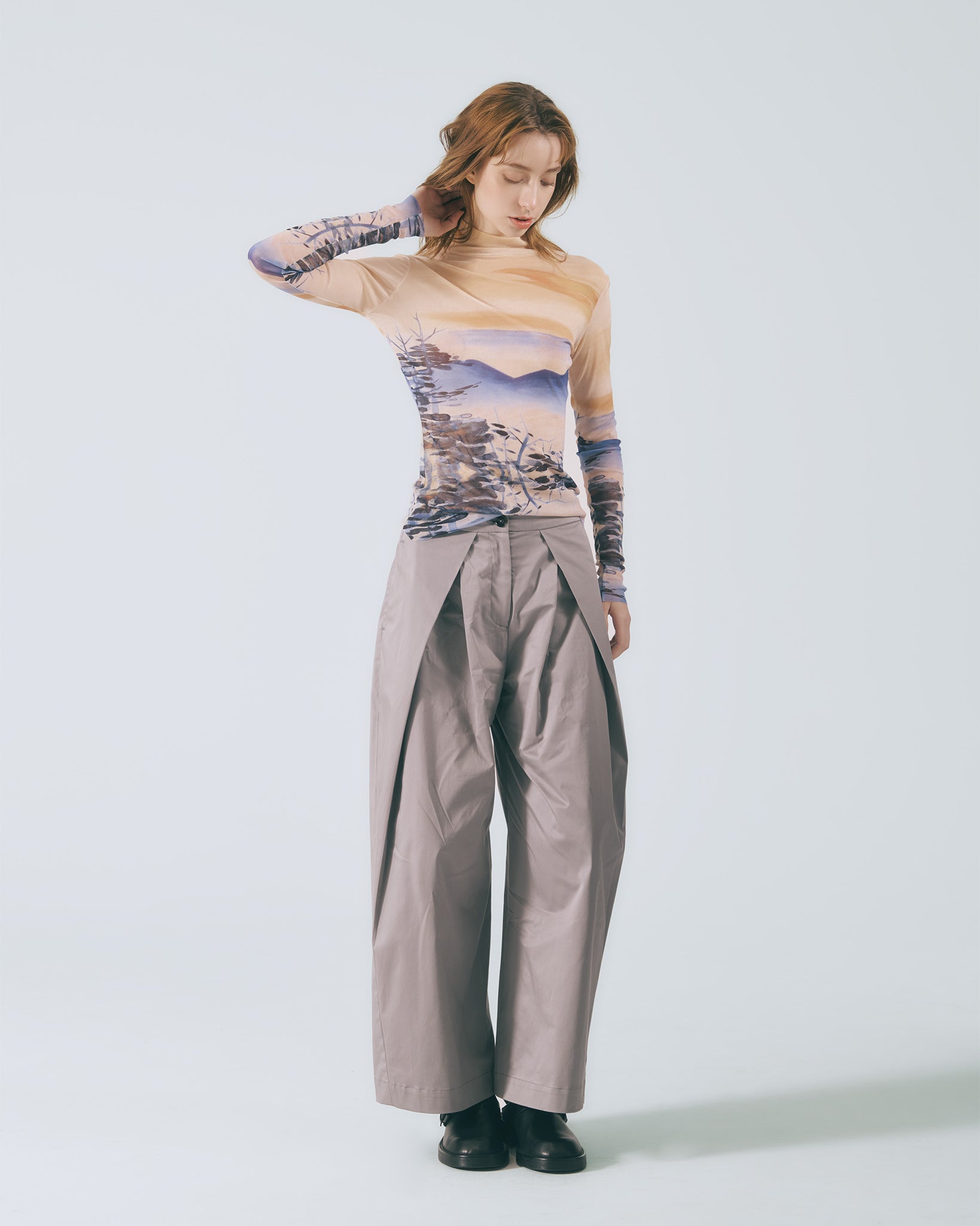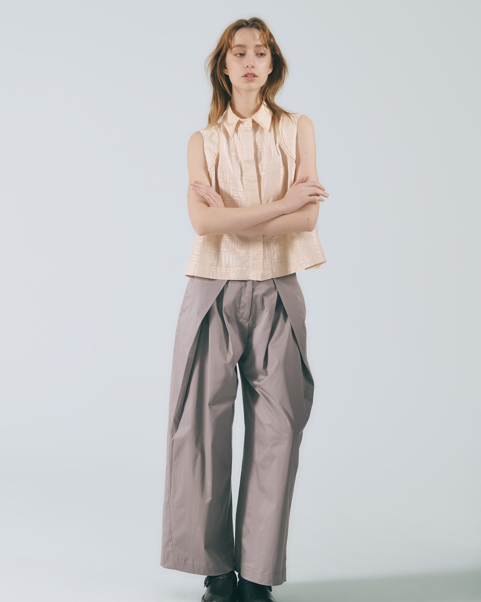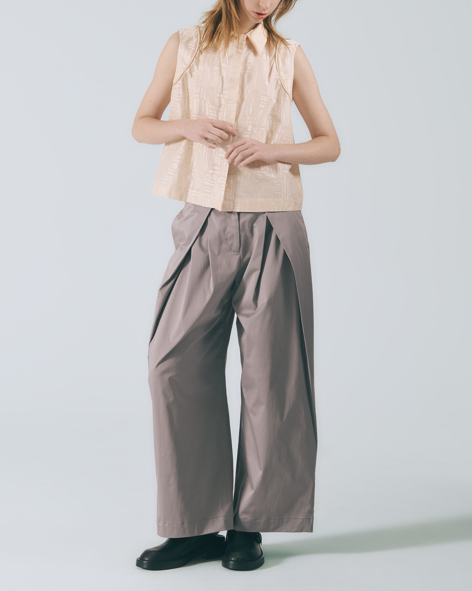 低調卻不失質感的灰色調,散發內斂沉穩的氛圍,輕鬆融入各式穿搭風格。褲型採用寬版高腰設計,修飾腰線比例的同時,帶來自在舒適的穿著體驗。褲腳自然垂墜,行走間呈現柔和流動感。前側對稱向內打摺設計自腰部一路延伸至褲口,巧妙堆疊出立體弧度,讓整體輪廓更顯俐落有型。側邊口袋兼顧實用機能,後腰鬆緊帶設計提升包容性,能自在適應多元身型,日常穿著輕鬆無負擔。