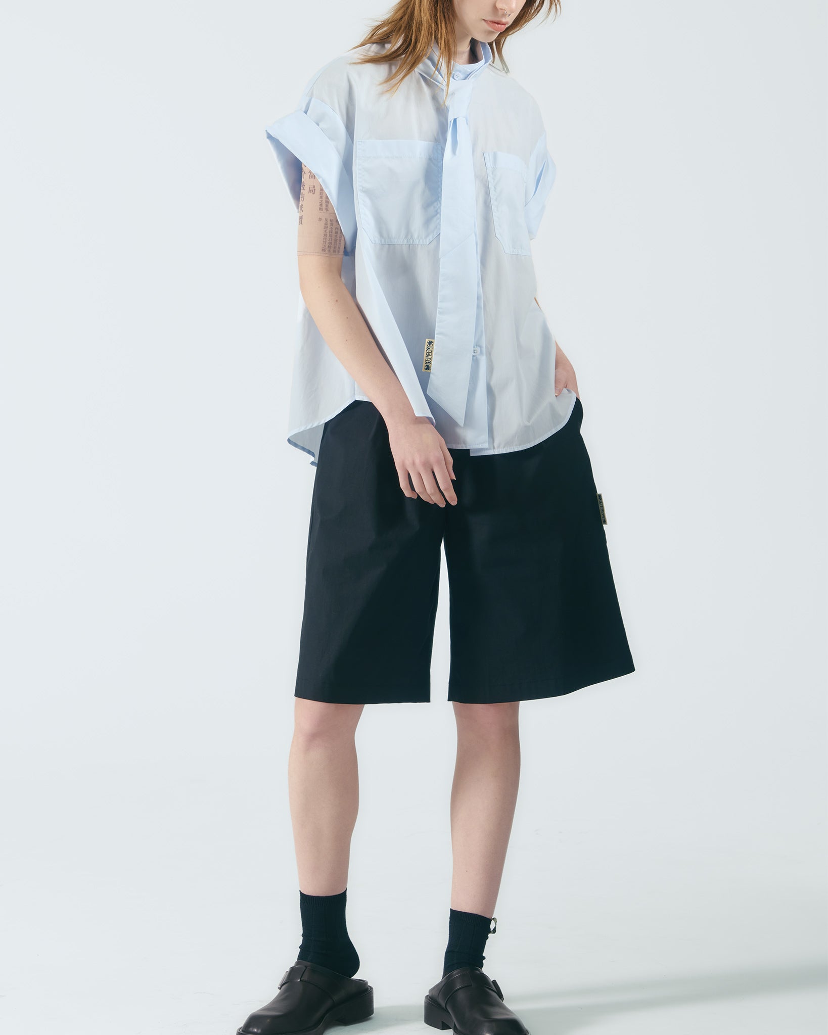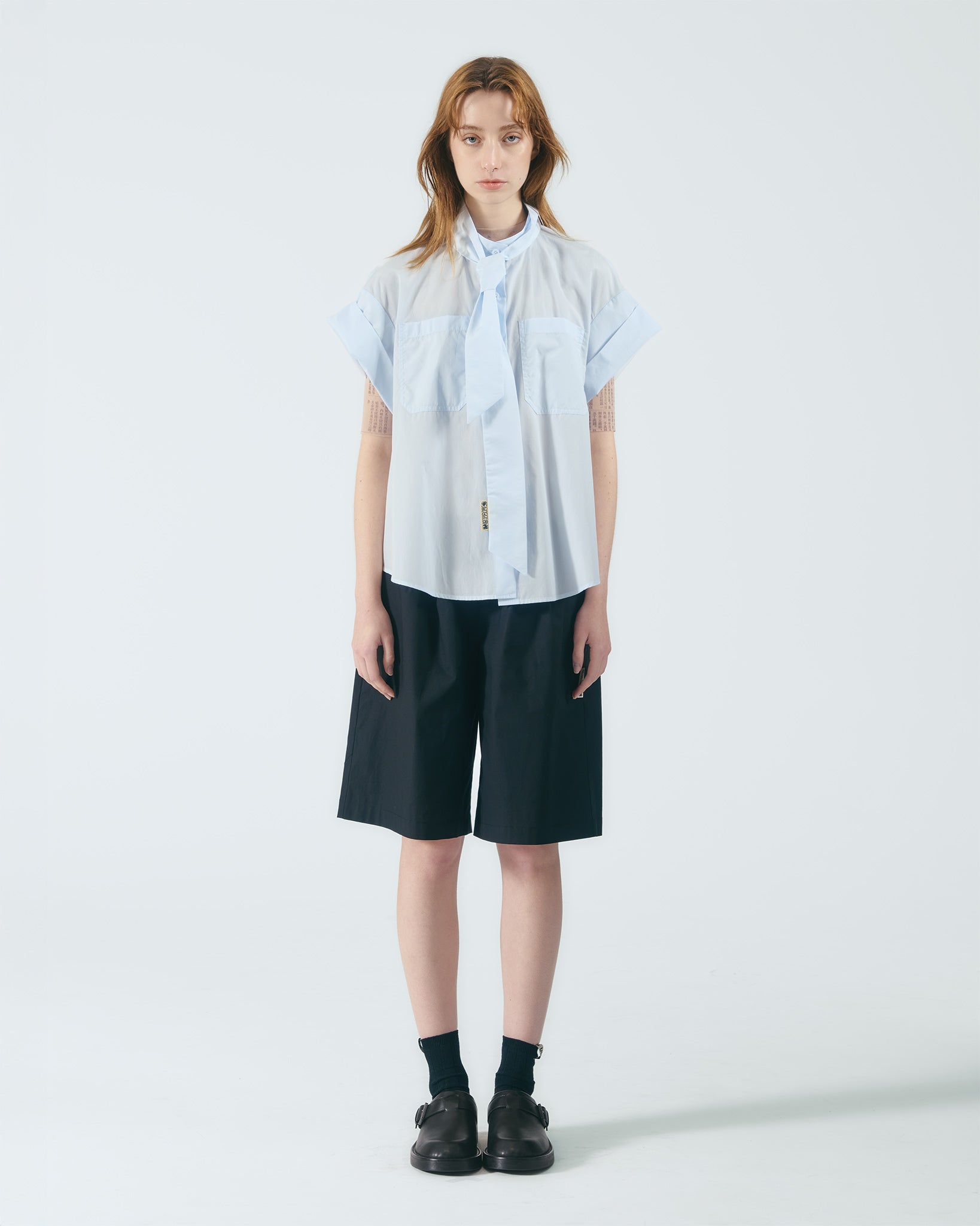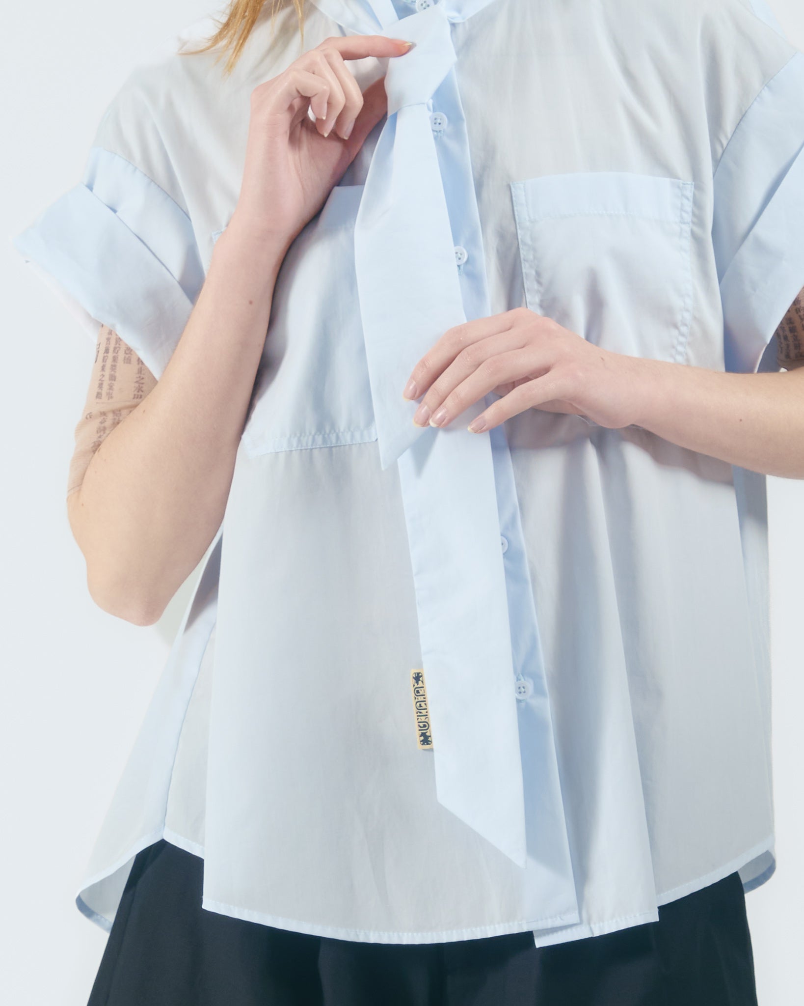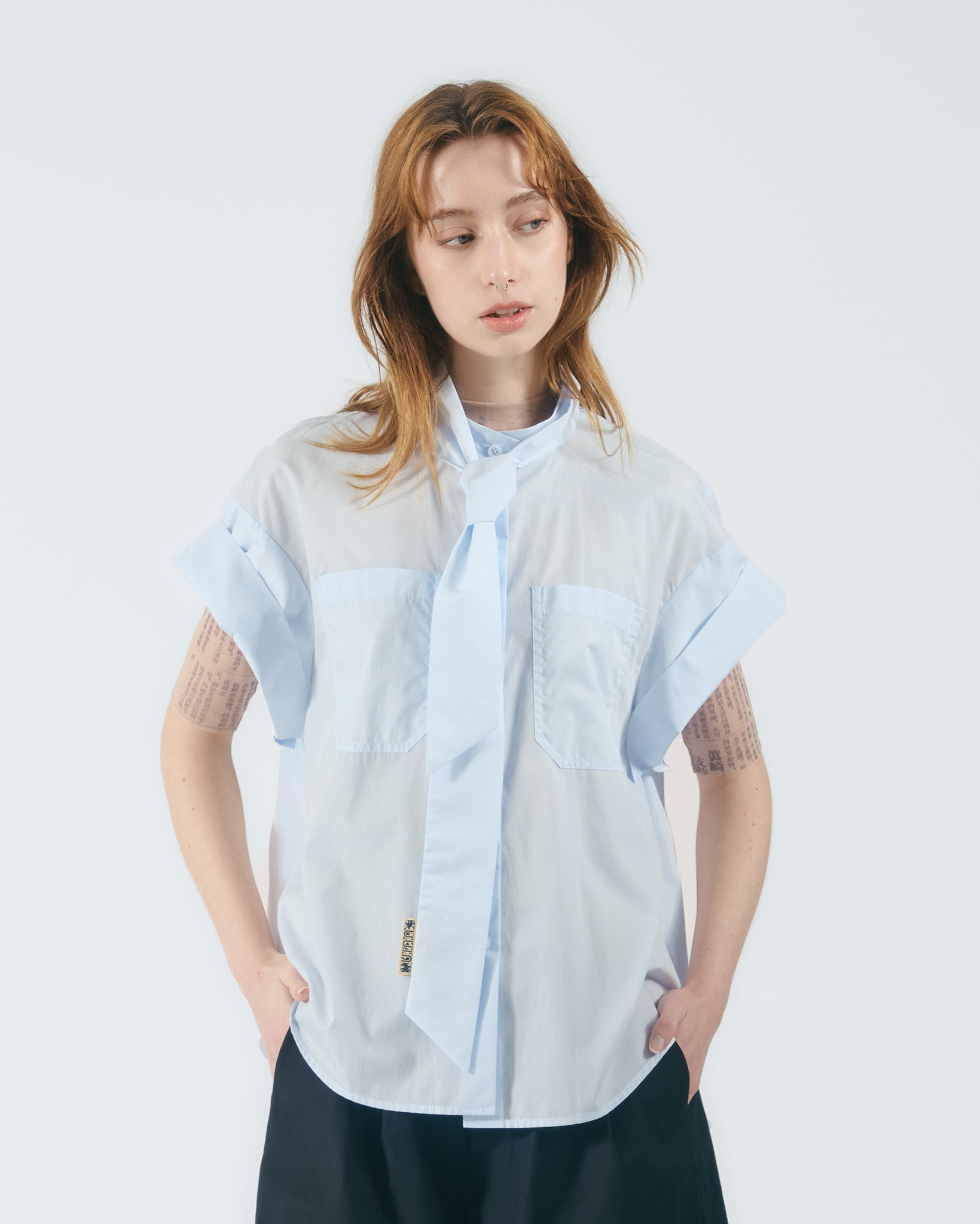 雙貼袋綁帶立領襯衫 (淺藍)