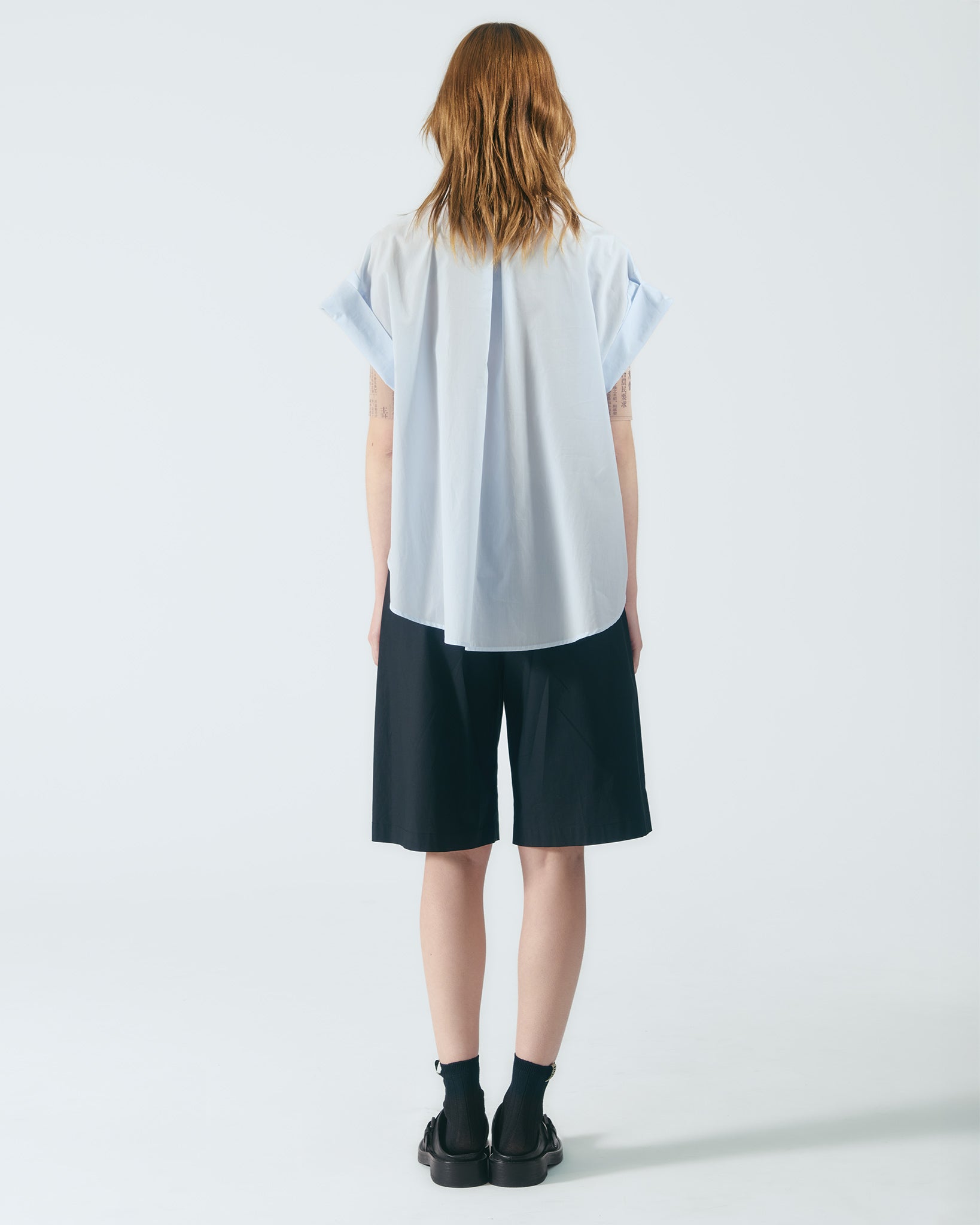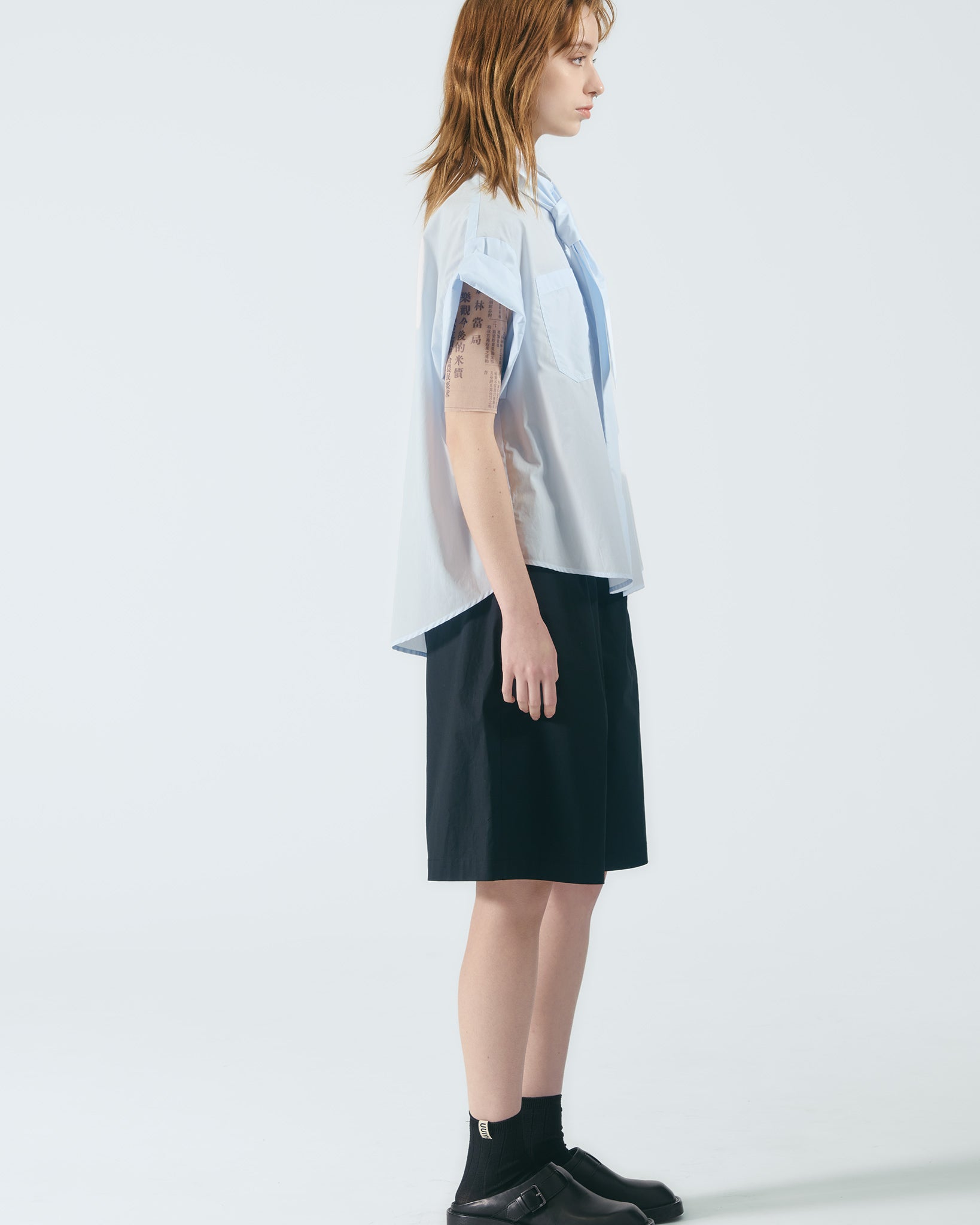 水藍色立領寬版造型,營造淡雅而清新的視覺風格。袖口可反摺延伸至肩部,變化穿著層次;胸前配置雙貼袋,增添實穿細節。領口綁帶可依個人喜好自由調整造型,綁帶尾端飾以限定精緻織標,靈感汲取自本季合作藝術家畫作《化粧》中的窗花圖樣,將歷史經典轉化為當代細節。
