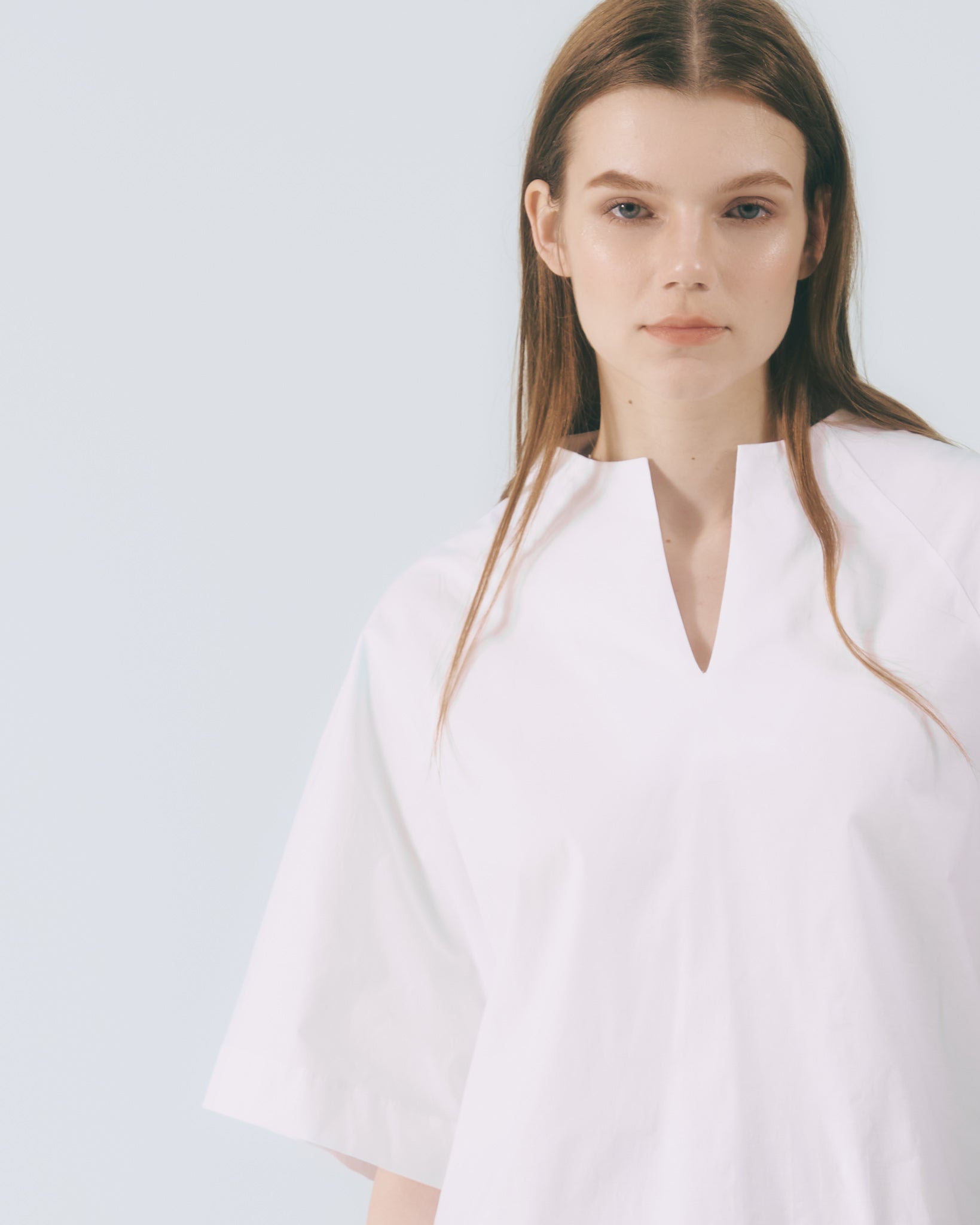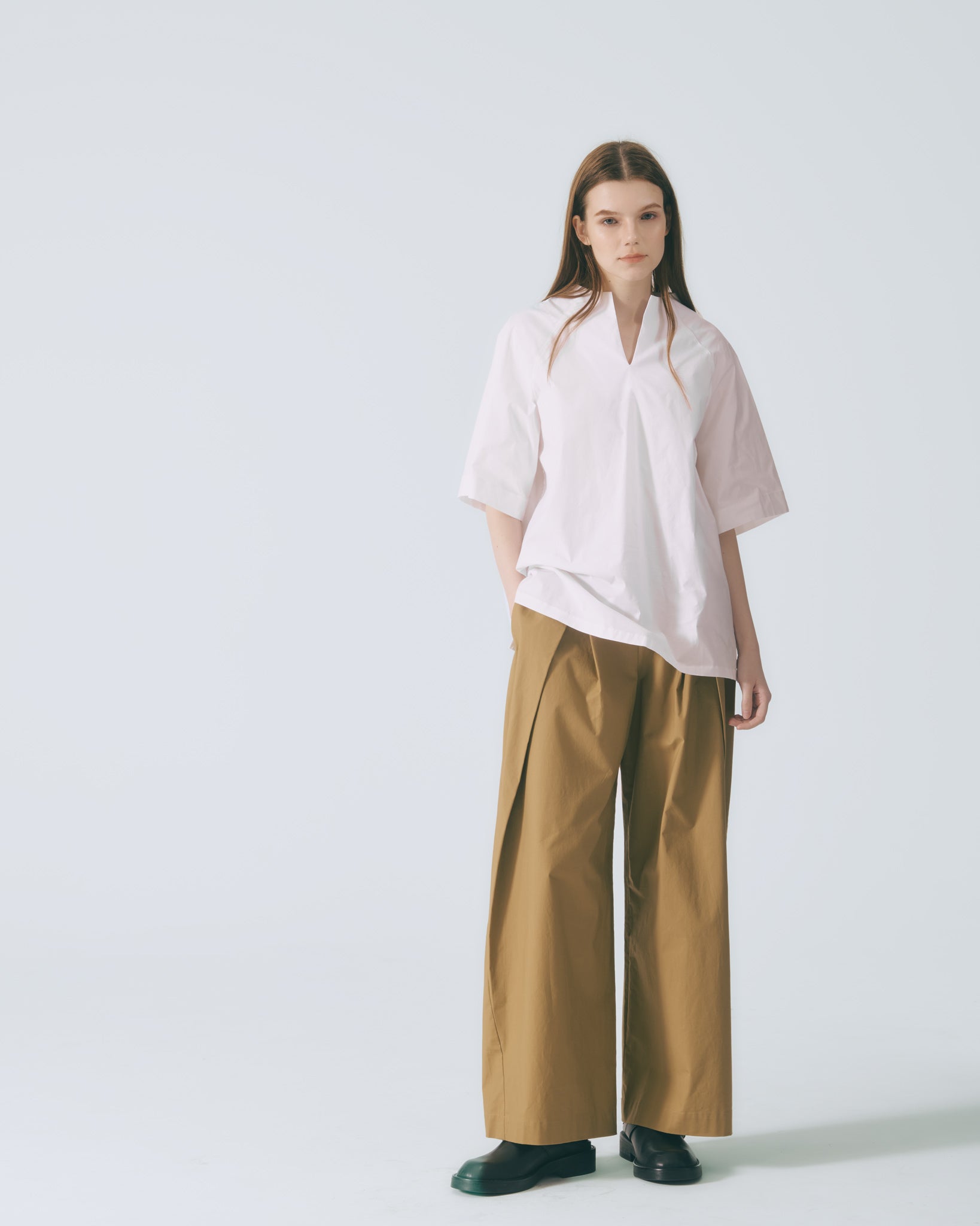 選用彈性棉質打造全白寬袖上衣,質地舒適輕盈。大V立領設計勾勒俐落線條,凸顯肩頸比例;五分寬鬆落肩剪裁,營造自在流動的穿著感受。衣身內側點綴蕾絲飾邊,細節融入本季合作藝術家畫作元素,在純粹中展現隱約的藝術層次。