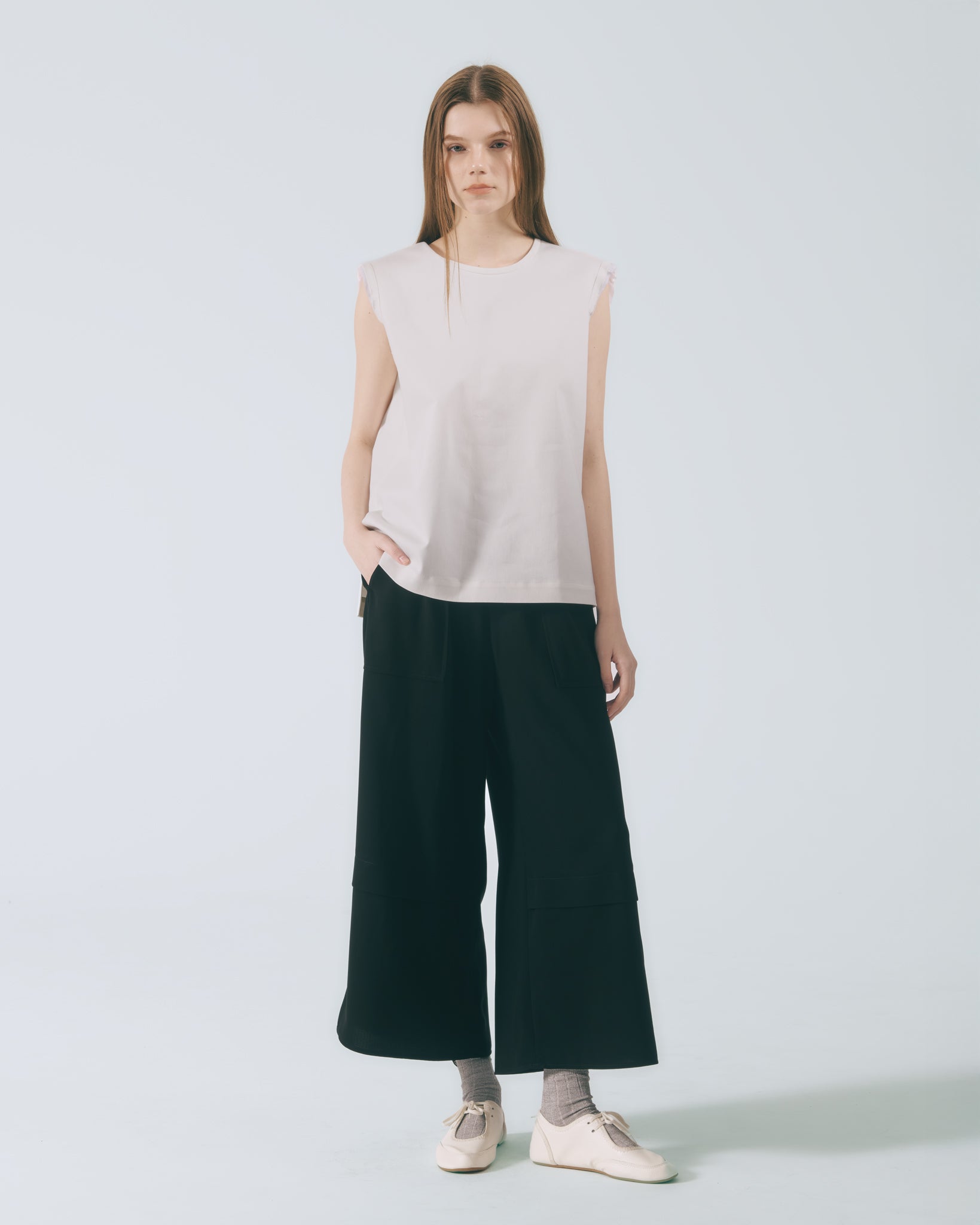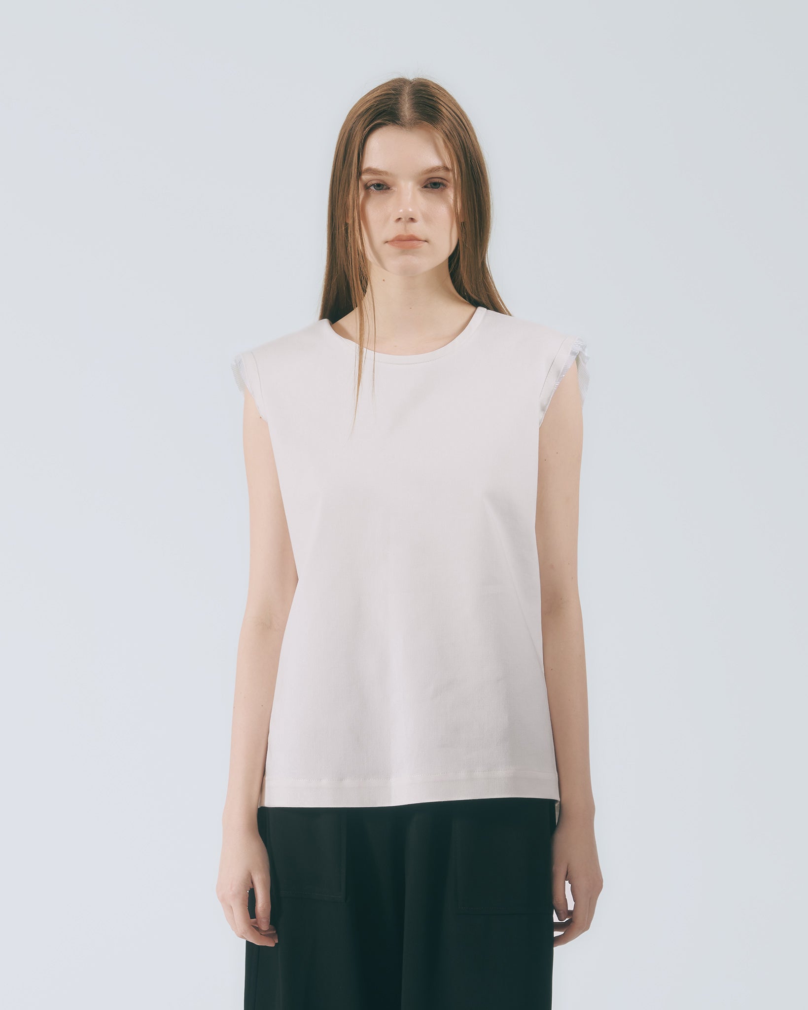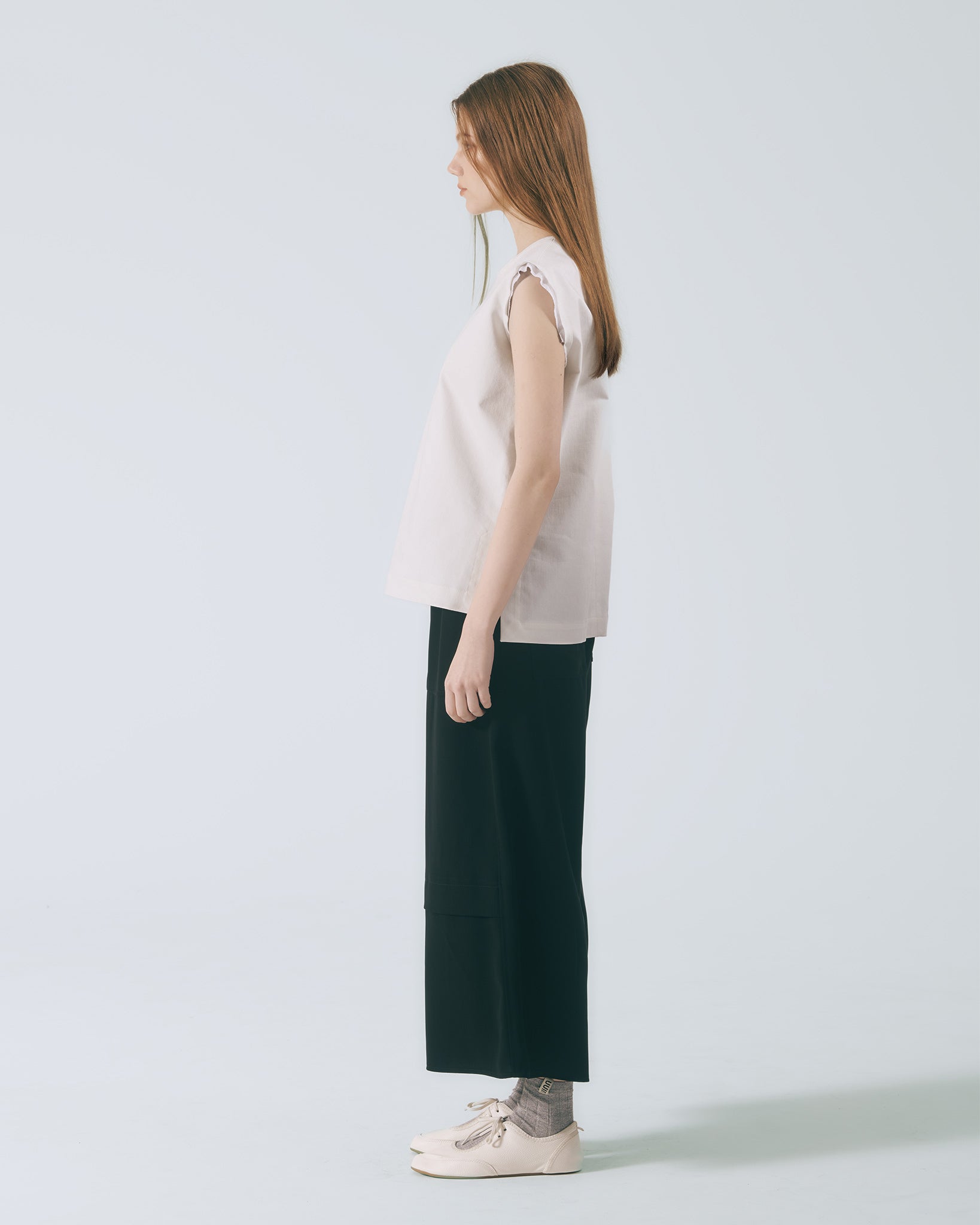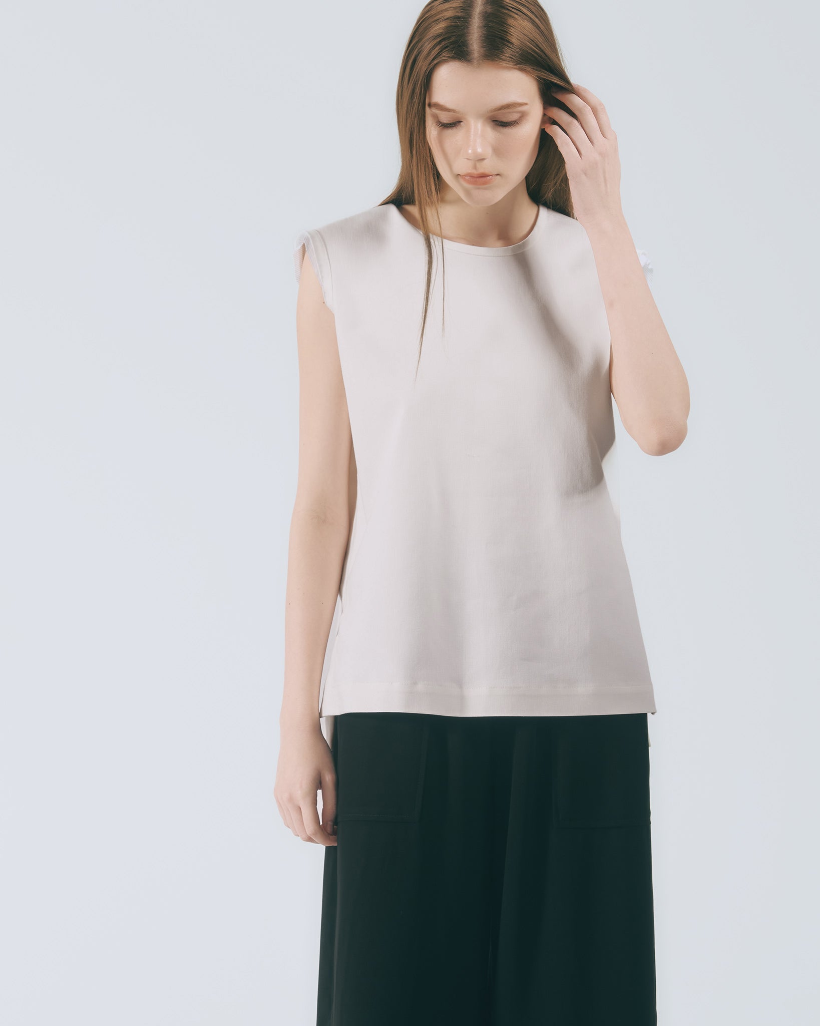 圓領無袖的寬鬆輪廓,帶出輕盈不受限的穿著感受。內領細緻蕾絲點綴,為簡約線條添上一抹柔軟層次;袖口以拼接不收邊處理,保留手感工藝的自然質地。前圓後 V 的領型設計,微微拉長肩頸比例,展現低調卻耐看的設計細節。
