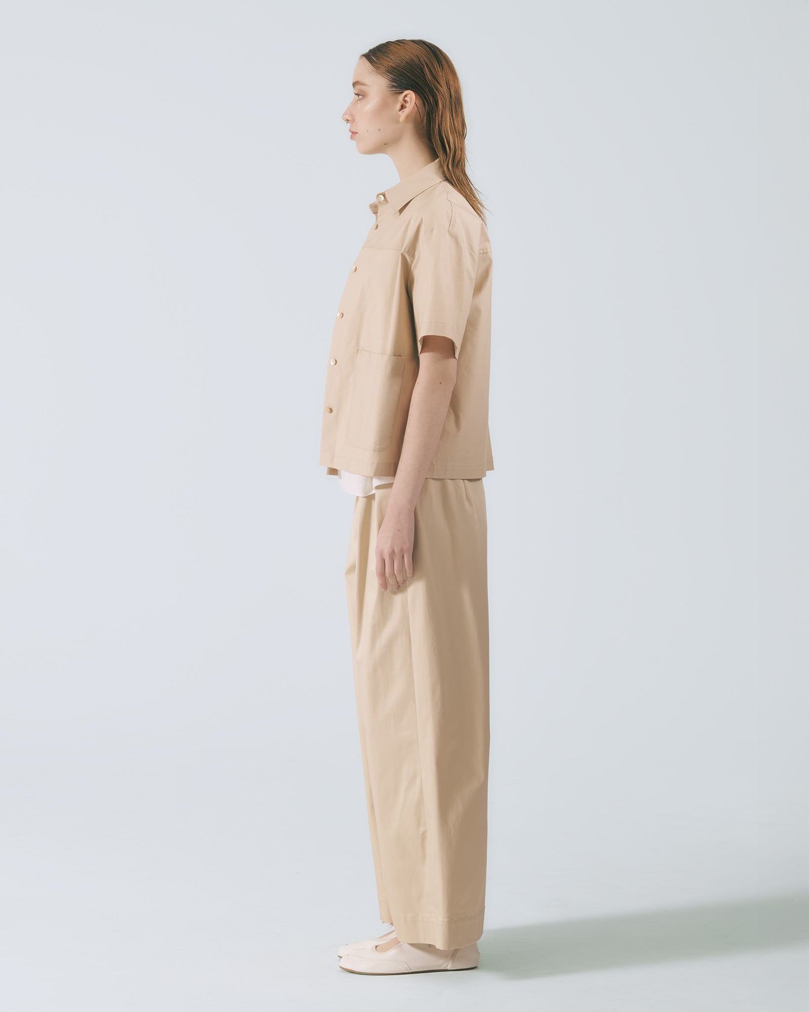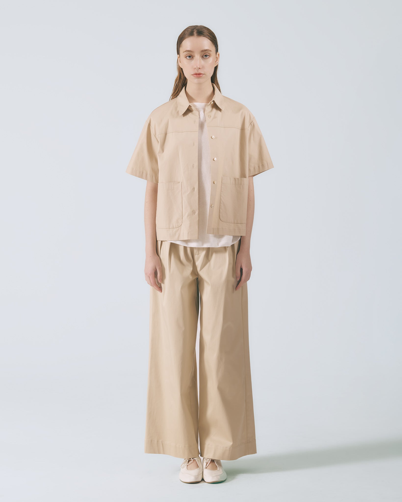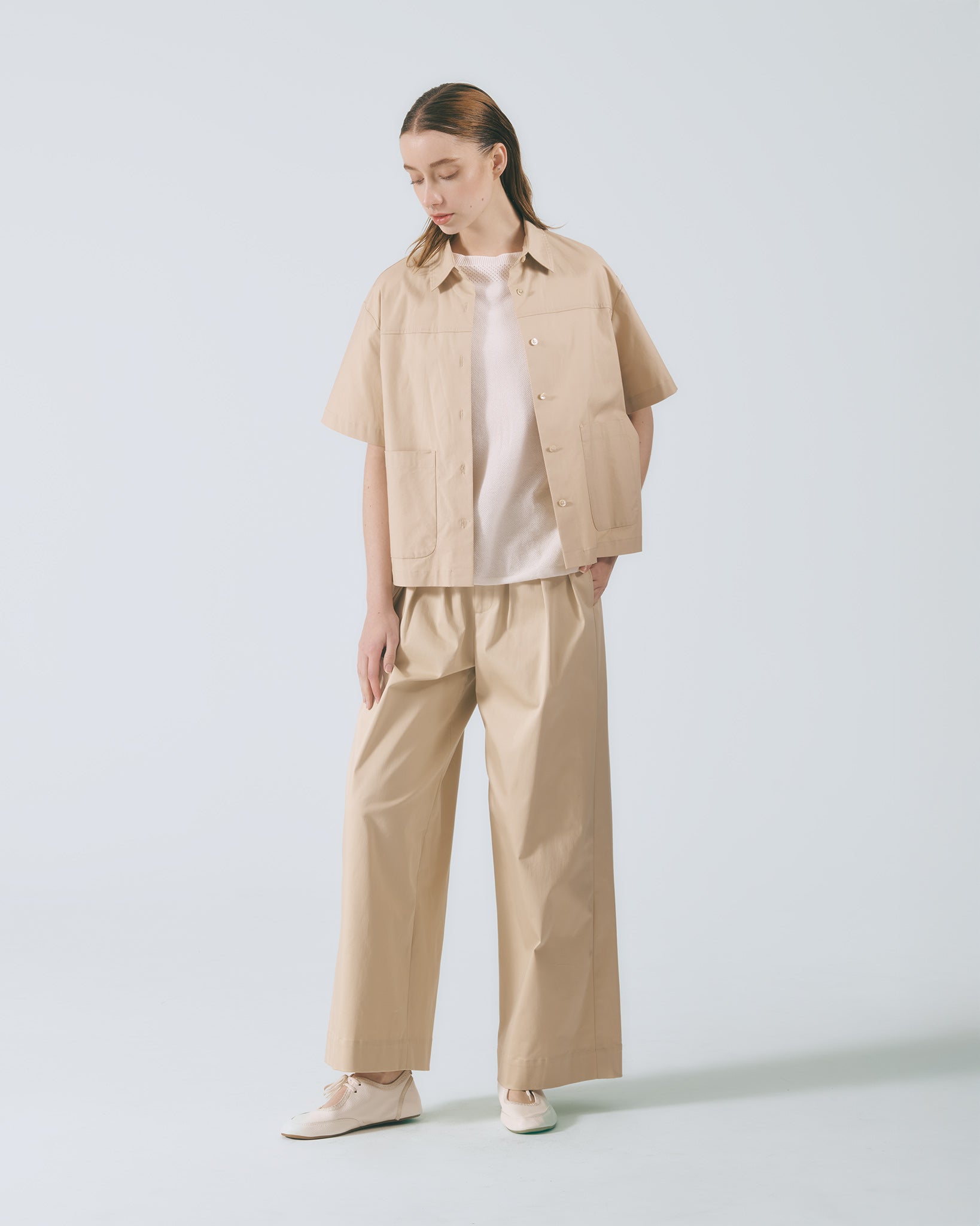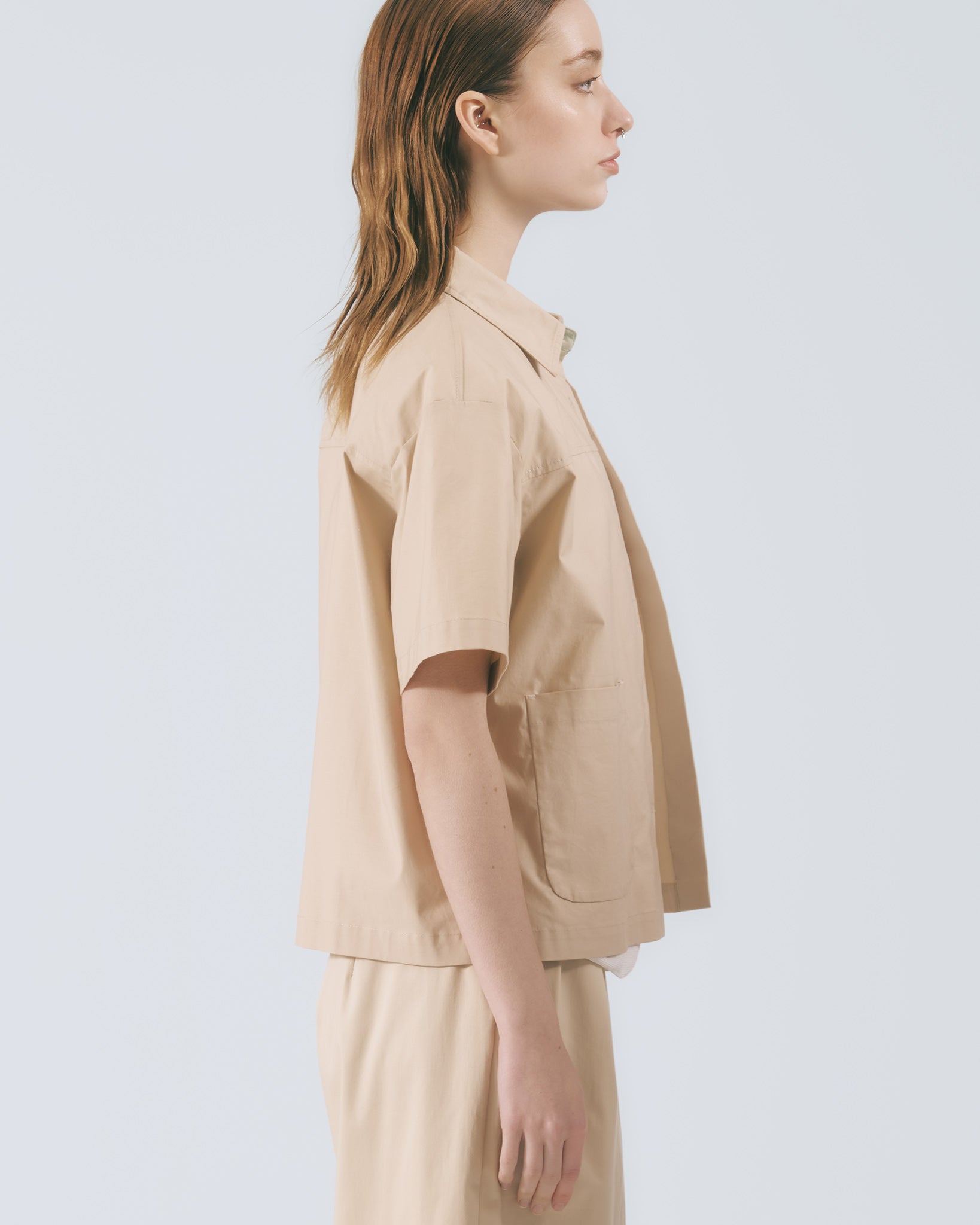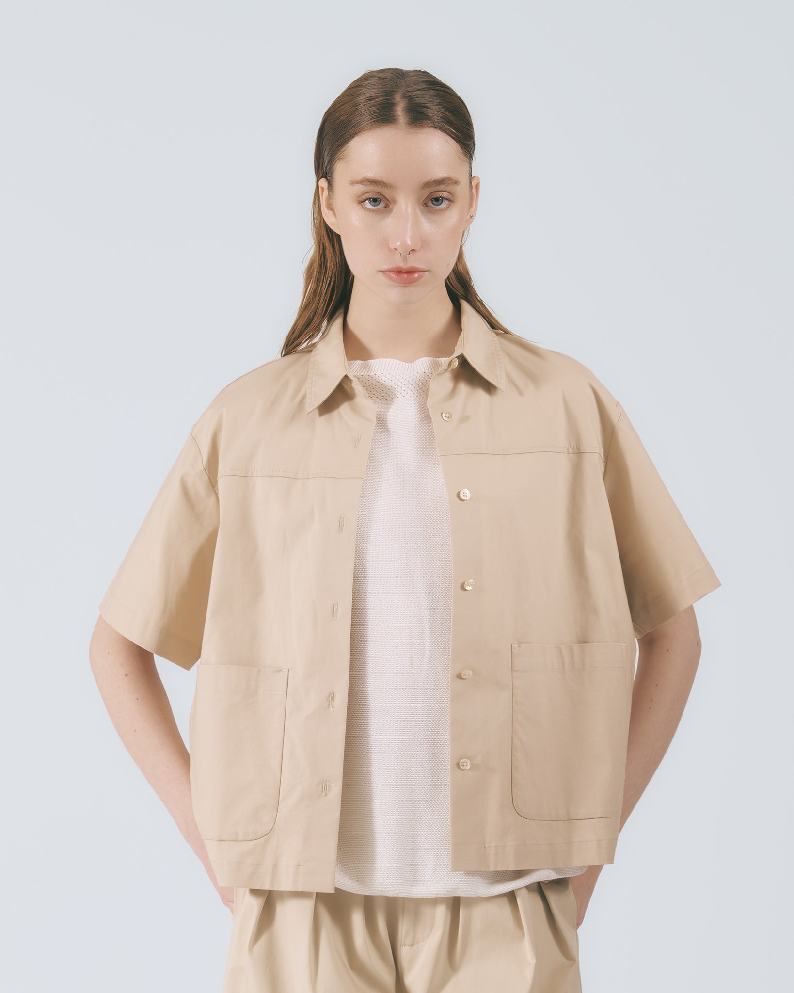 襯衫領搭配五分短袖,肩部融入工裝切線設計,為整體輪廓增添俐落的層次結構。前方方形貼袋點綴,呼應實用機能語彙,自在而輕盈的剪裁,適合春夏日常穿著。深棕色調沉穩內斂,能輕鬆搭配多種風格單品,以簡約線條勾勒出不凡質感。