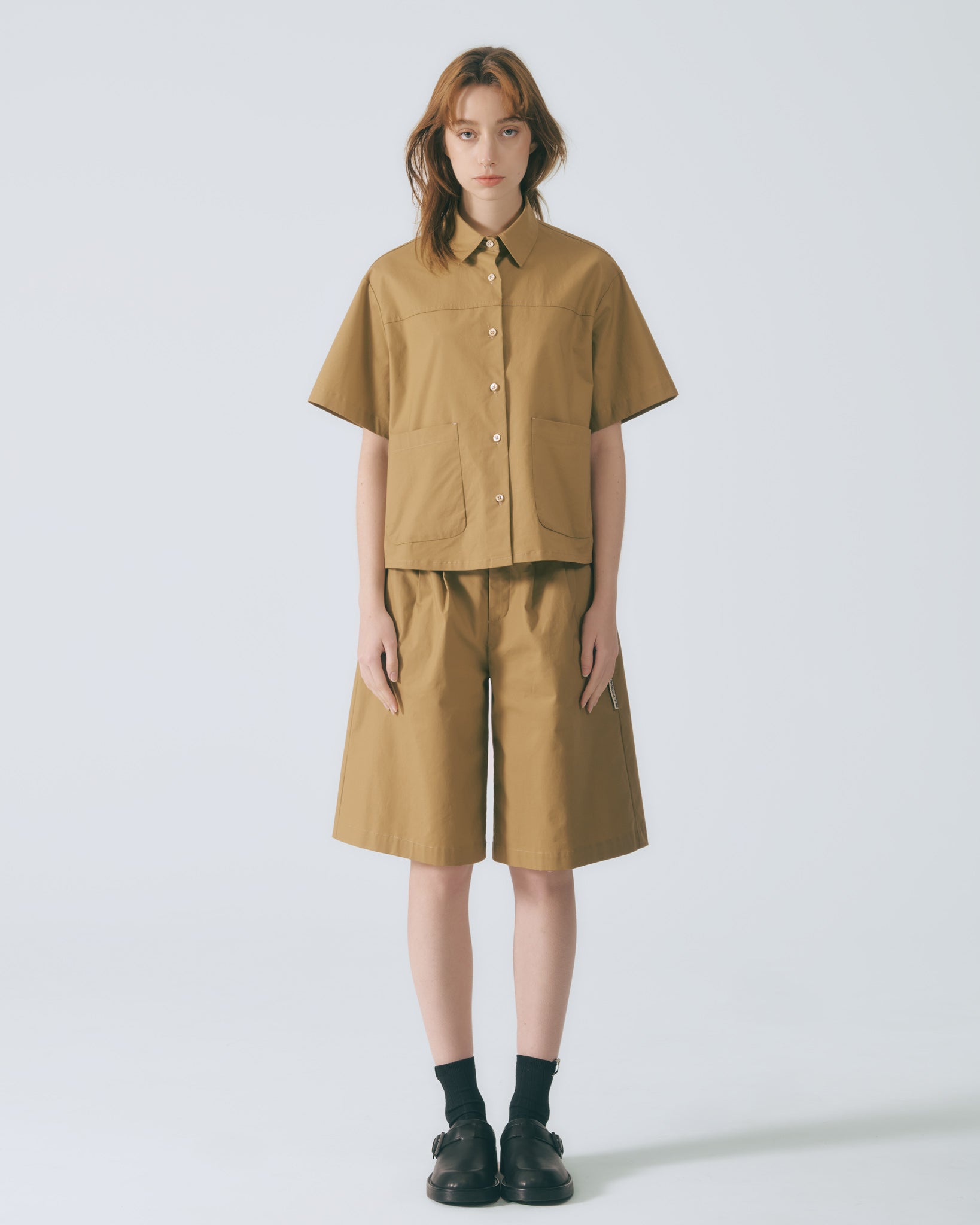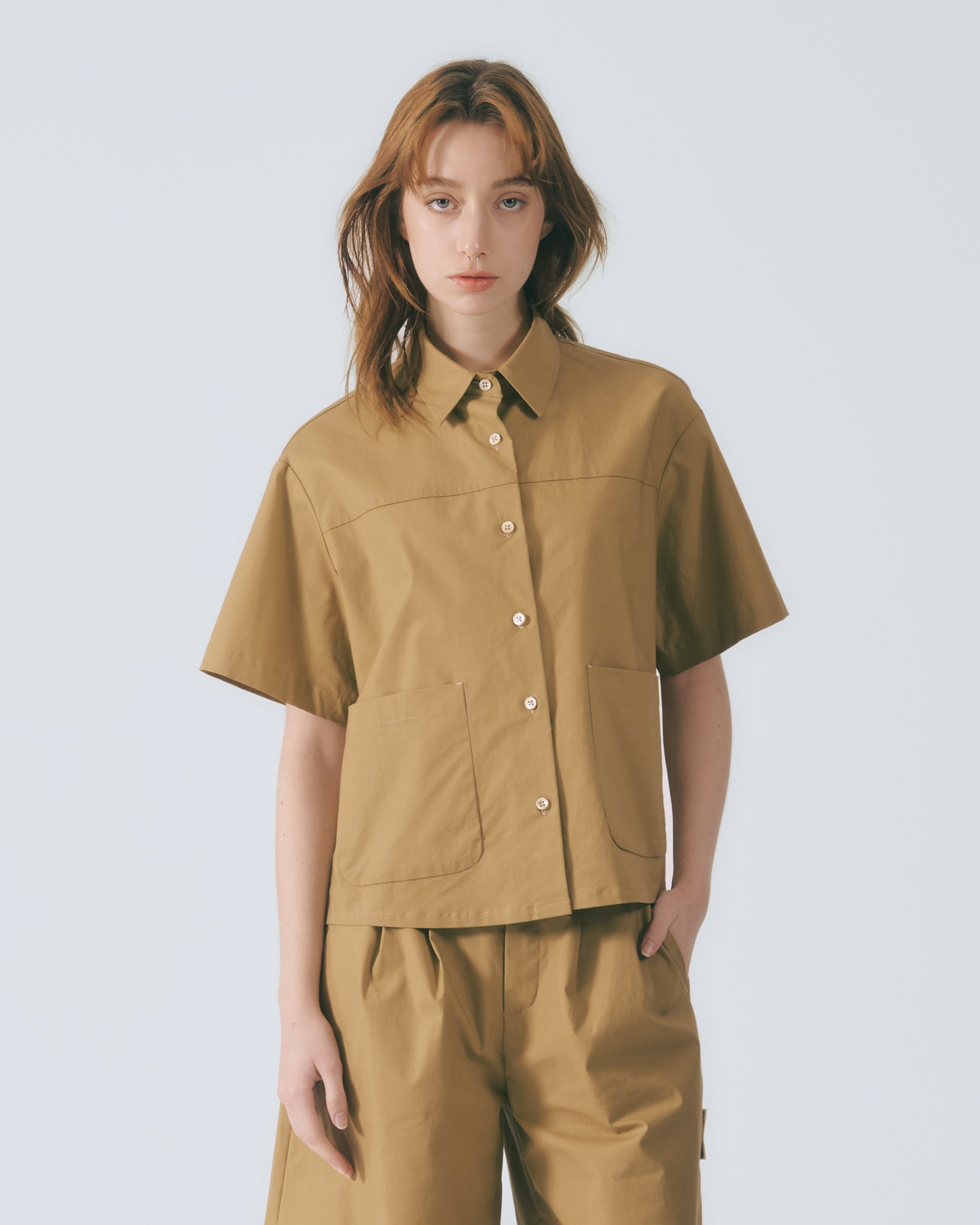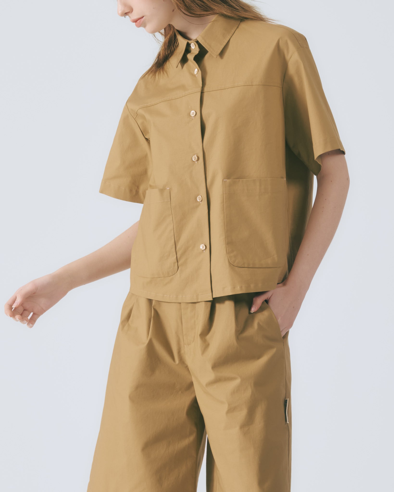 工裝貼袋短袖襯衫 (卡其)