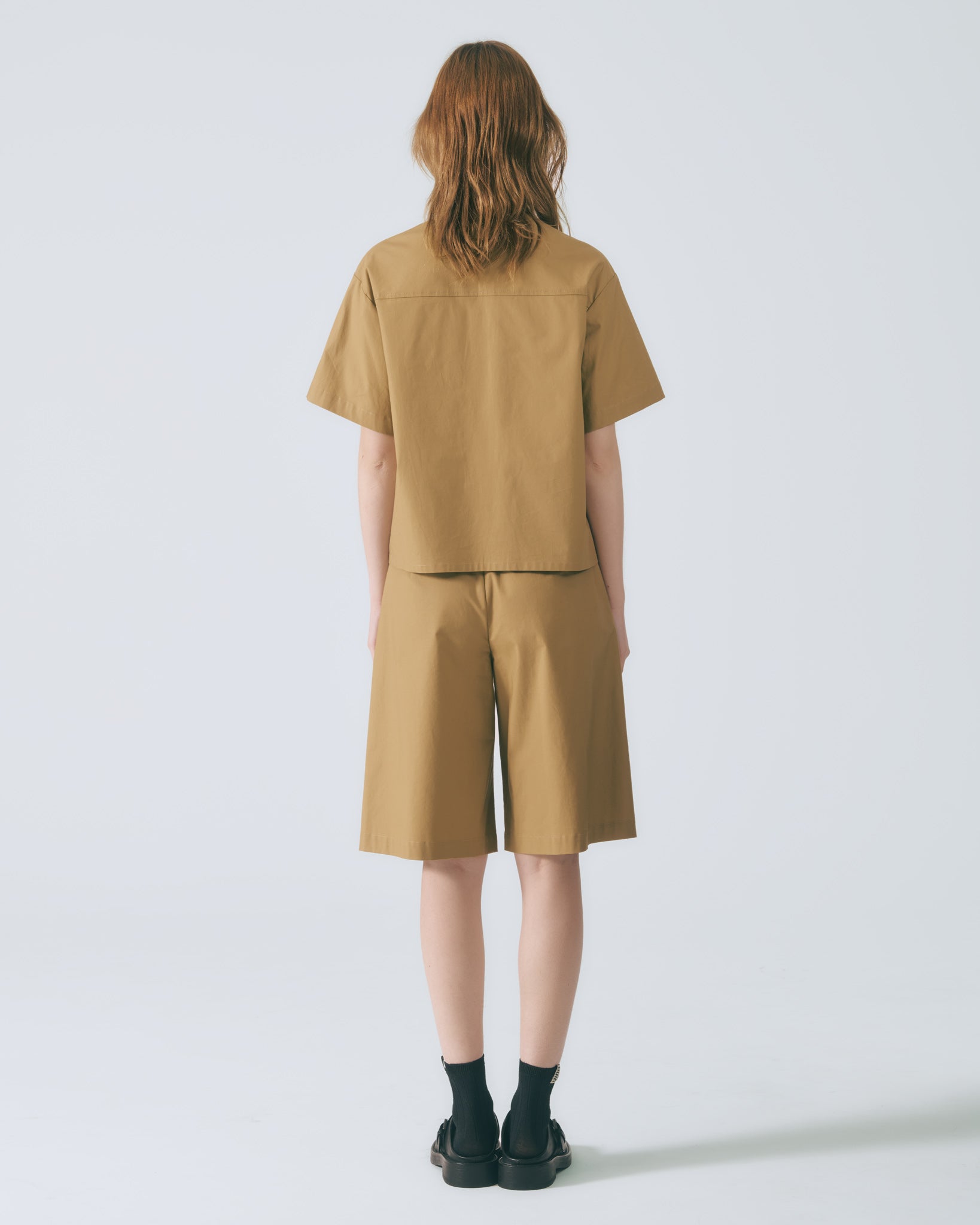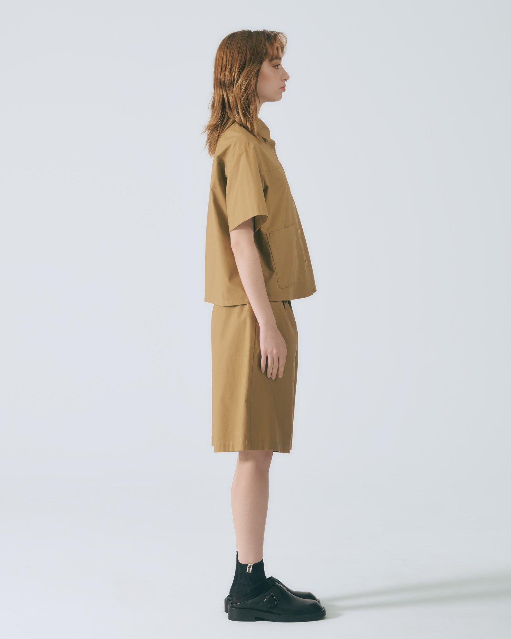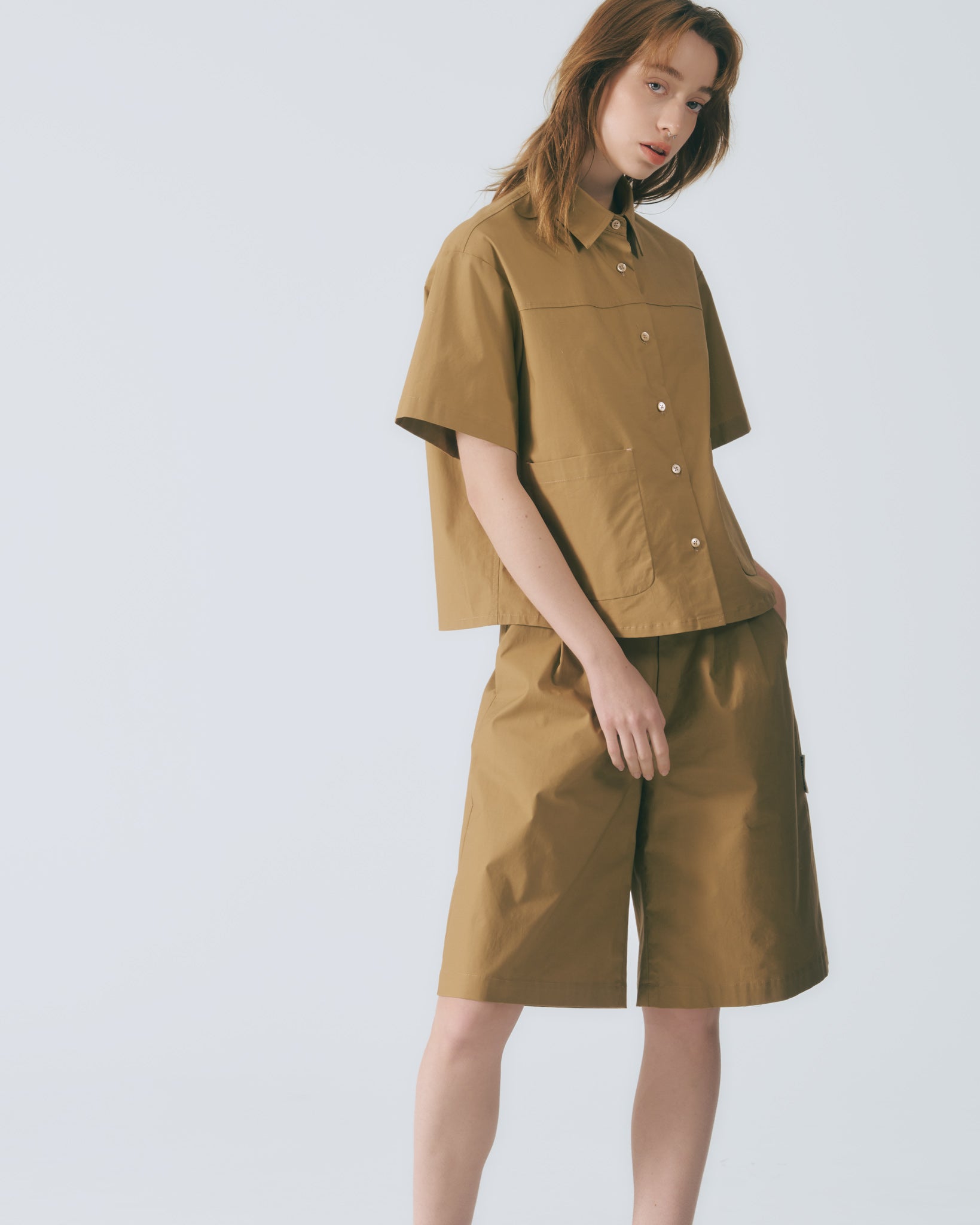 襯衫領搭配五分短袖,肩部融入工裝切線設計,為整體輪廓增添俐落的層次結構。前方方形貼袋點綴,呼應實用機能語彙,自在而輕盈的剪裁,適合春夏日常穿著。深棕色調沉穩內斂,能輕鬆搭配多種風格單品,以簡約線條勾勒出不凡質感。
